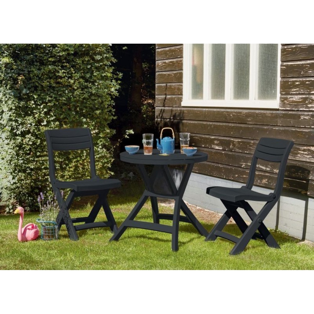 ALLIBERT JAZZ Zestaw mebli ogrodowych, grafit 17204593Kompaktowy, składany zestaw balkonowy TACOMA & OREGON BALCONY SET, w stylu przywodzącym na myśl widok włoskich kawiarenek. Dwa nowoczesne w formie krzesła i okrągły stoliczek, inspirowane naturalnym rysunkiem drewna, gwarantują komfortowy wypoczynek. Zestaw dedykowany jest osobom, którzy na niewielkiej przestrzeni aranżują kącik wypoczynkowy z możliwością zjedzenia posiłku na świeżym powietrzu. Produkty są trwałe i odporne na działanie czynników zewnętrznych oraz promieni UV.