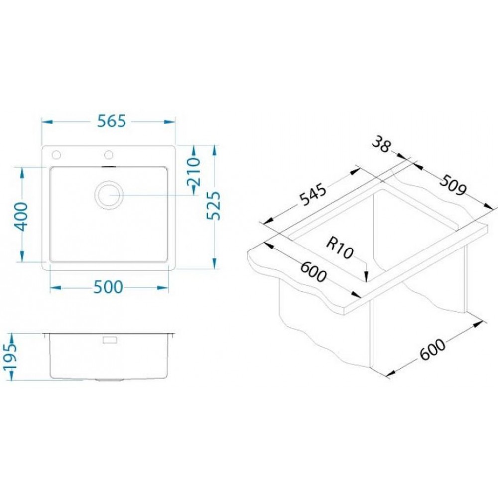 - Wymiary zlewozmywaka: 565 x 525 mm