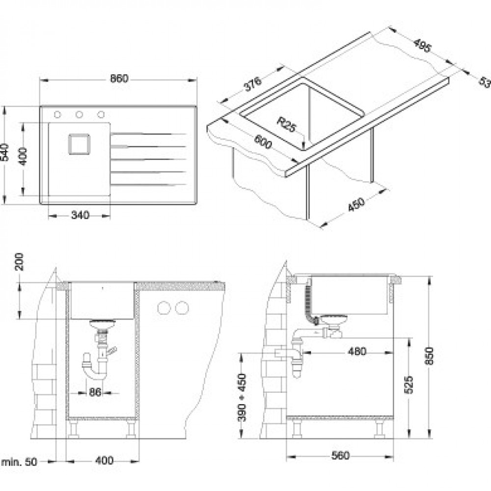 - Wymiary zlewozmywaka: 860 x 540 mm