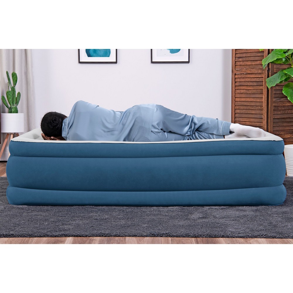 Ten dmuchany materac ma miękką, przypominającą aksamit powierzchnię do spania, która jest równie wygodna, co trwała. Odpływaj wygodnie na luksusowych belkach falistych, które pomagają utrzymać wyrównanie kręgosłupa i zapewniają wyprofilowane zmniejszenie nacisku podczas snu. Otaczająca konstrukcja zapobiega również sturlaniu się przez całą noc.