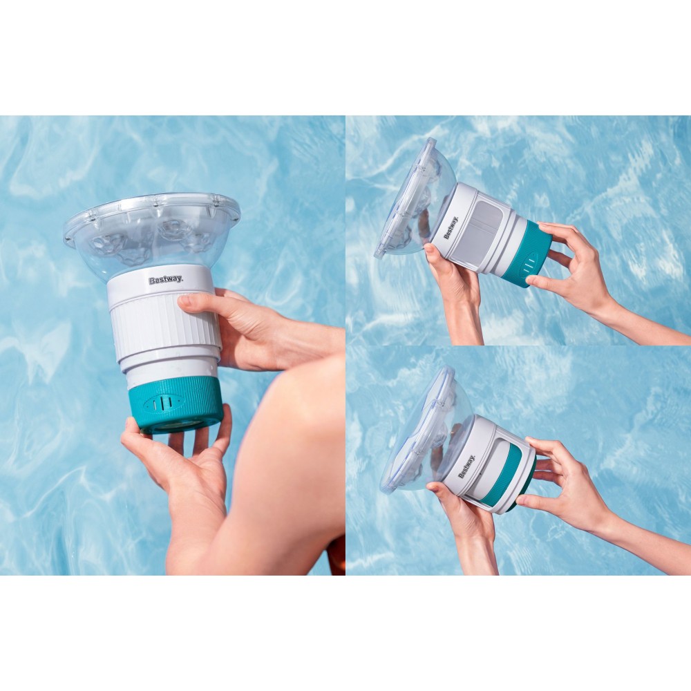 BESTWAY SolarGlow™ Dozownik chemikaliów ⌀ 18 × 21,5 cm to idealne połączenie funkcjonalnej pielęgnacji basenu i efektownego oświetlenia, które uprzyjemni letnie wieczory i zapewni czystą, bezpieczną wodę dla całej rodziny.