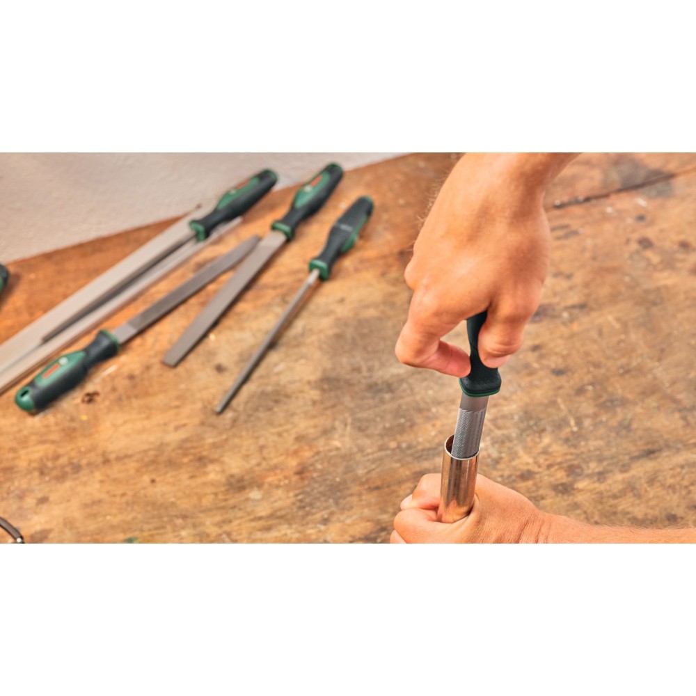 Narzędzia wykonane są z wysokiej jakości stali węglowej (63 ± 3 HRC), zapewniającej trwałość i odporność. Ergonomicznie zaprojektowane uchwyty z miękką powierzchnią chwytu i miejscem na kciuk pomagają redukować zmęczenie dłoni i ułatwiają obsługę narzędzia. Szczotka do pilników pomaga utrzymać pilniki w czystości i sprawności. Narzędzie wyposażone jest w praktyczny otwór do zawieszenia, umożliwiający łatwe przechowywanie i szybki dostęp. Pilniki są zgodne z normą ISO 234.