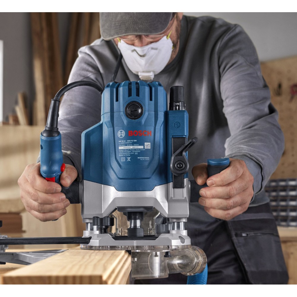 GOF 20-12 jest wyposażona w pokrętło regulacji prędkości po lewej stronie oraz blokowany włącznik na prawej rękojeści, łatwo dostępną dźwignię zanurzeniową oraz specjalne adaptery do odsysania pyłu zarówno przy frezowaniu powierzchni, jak i krawędzi.