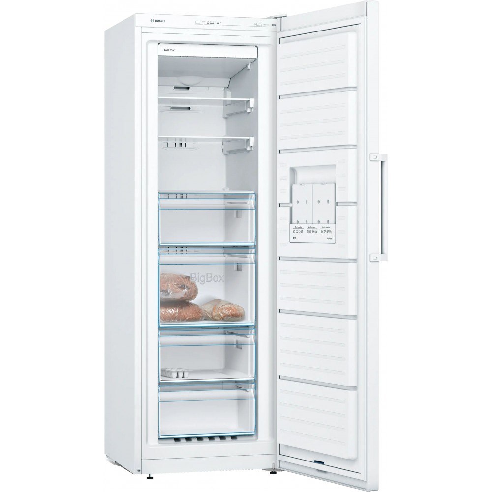 Jeśli szukasz wolnostojącej zamrażarki NoFrost o wymiarach 176 x 60 cm z przejrzystym wnętrzem i funkcjami ułatwiającymi szybkie oraz bezpieczne mrożenie, Bosch Serie 4 GSN33VWEP będzie doskonałym wyborem. Duża pojemność, elastyczność systemu VarioZone oraz dodatkowa przestrzeń w szufladzie BigBox zapewniają komfort użytkowania każdego dnia.
