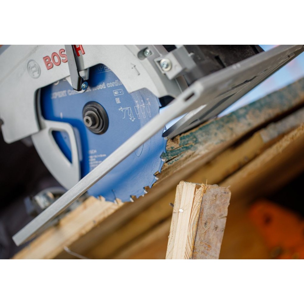 Tarcza EXPERT Construct Wood cordless ma ostre zęby z drobnoziarnistego węglika spiekanego wykonane w technologii Bosch Carbide Technology. Jest dzięki temu solidna i wytrzymuje dłużej niż jakakolwiek inna tarcza pilarska do drewna konstrukcyjnego w naszej ofercie. Pokryliśmy ją dodatkową powłoką, która zapobiega jej nagrzewaniu się i chroni ją przed korozją. Wyjątkowo cienki rzaz i ostre kąty zębów ograniczają tarcie, dzięki czemu polerka zużywa mniej energii i pozwala pracować dłużej bez ładowania baterii.