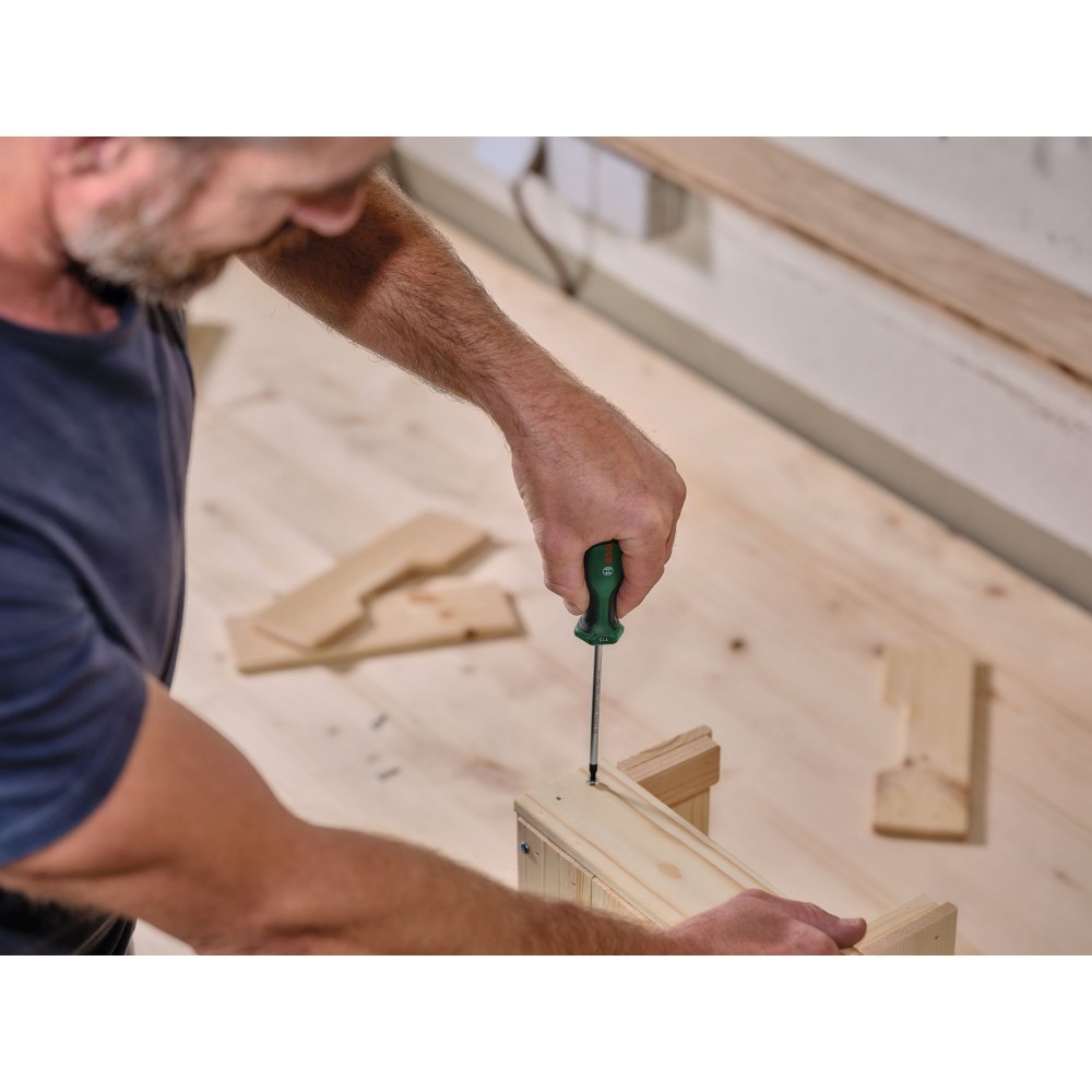 Szybko i efektywnie wykonuj dowolne prace montażowe z pomocą wysokiej jakości wkrętaka Bosch – zaprojektowanego z myślą o najwyższej wydajności i maksymalnym komforcie. Wkrętak posiada grot z powłoką chromową, wykonany z bardzo twardej stali S2, który zapewnia solidny moment obrotowy:, przewyższający wymagania normy (TMD-705) o co najmniej 40%. Aby zapewnić stabilność wkręcania i lepszy kontrast wizualny, końcówka wkrętaka (58 ±3 HRC) jest magnetyczna i ma fosforowaną powierzchnię w kolorze czarnym. Dwukomponentowa rękojeść jest wyposażona w miękką okładzinę Softgrip, która poprawia komfort pracy. Sześciokątny kształt przedniej części rękojeści zapobiega się staczaniu się narzędzia. Który wkrętak Bosch do jakiego zastosowania? Wybór jest łatwy i szybki dzięki kolorowym oznaczeniom rozmiaru i typu.