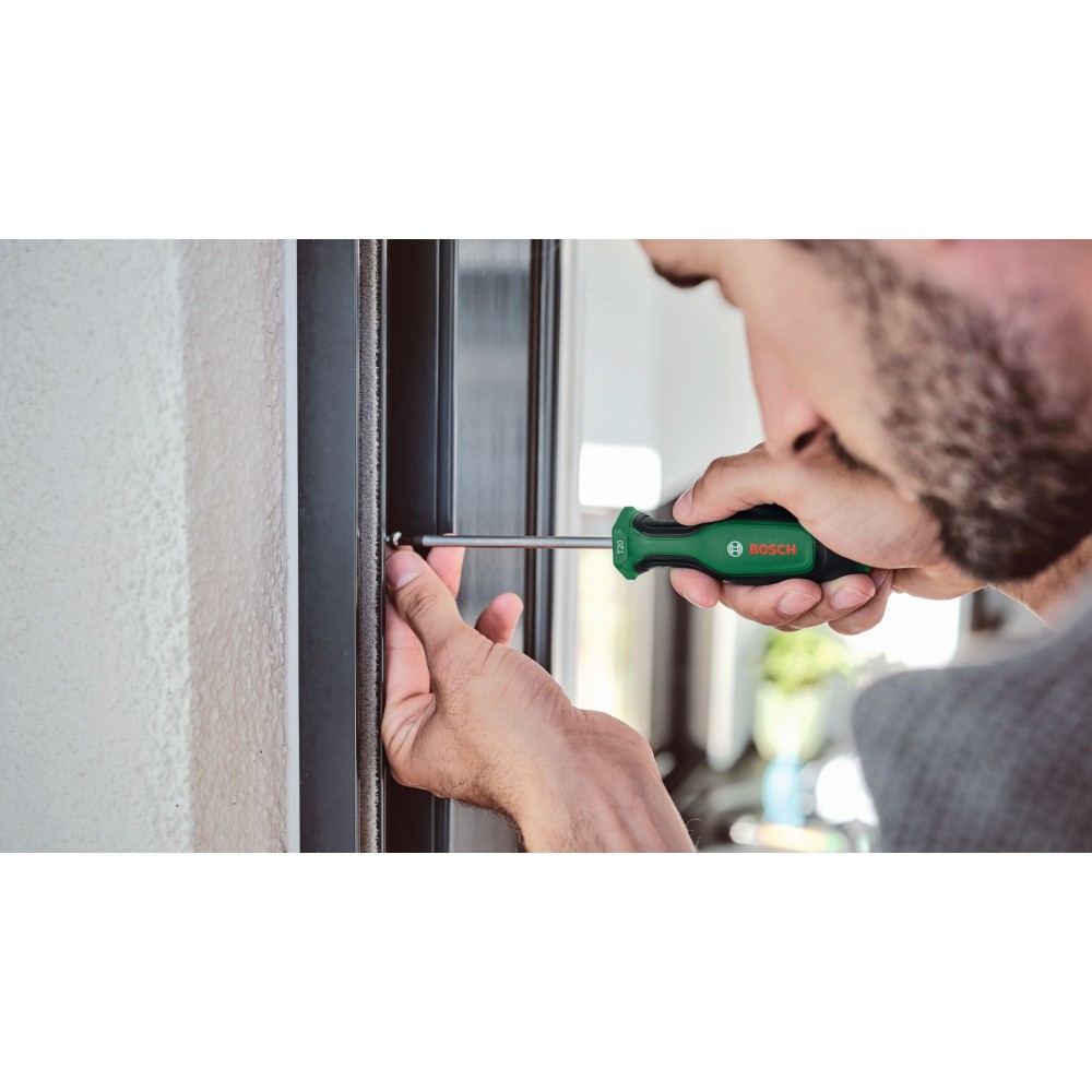 Szybko i efektywnie wykonuj dowolne prace montażowe z pomocą wysokiej jakości wkrętaka Bosch – zaprojektowanego z myślą o najwyższej wydajności i maksymalnym komforcie. Wkrętak posiada grot z powłoką chromową, wykonany z bardzo twardej stali S2, który zapewnia solidny moment obrotowy:, przewyższający wymagania normy (TMD-705) o co najmniej 40%. Aby zapewnić stabilność wkręcania i lepszy kontrast wizualny, końcówka wkrętaka (58 ±3 HRC) jest magnetyczna i ma fosforowaną powierzchnię w kolorze czarnym. Dwukomponentowa rękojeść jest wyposażona w miękką okładzinę Softgrip, która poprawia komfort pracy. Sześciokątny kształt przedniej części rękojeści zapobiega się staczaniu się narzędzia. Który wkrętak Bosch do jakiego zastosowania? Wybór jest łatwy i szybki dzięki kolorowym oznaczeniom rozmiaru i typu.