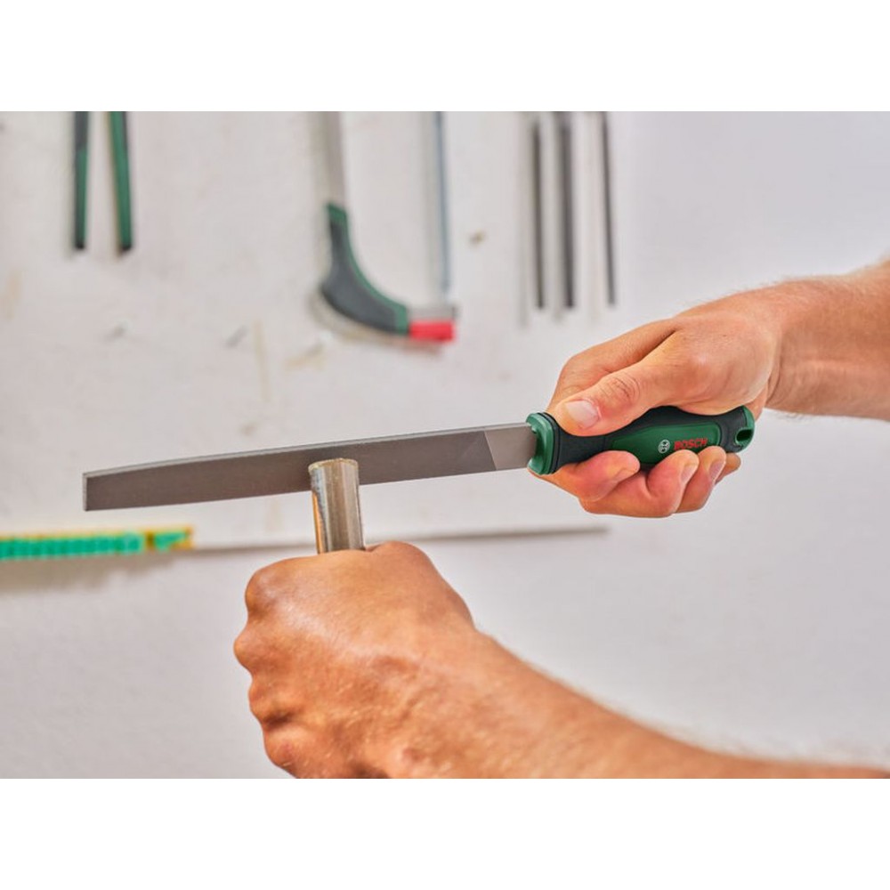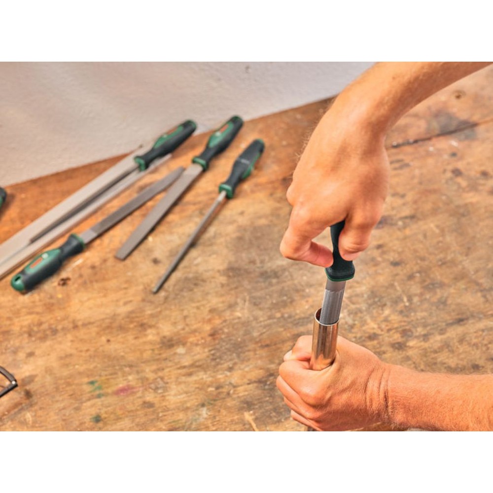 Popraw swoje doświadczenia podczas pracy w drewnie dzięki 5-częściowemu zestawowi pilników Bosch 200 mm z hartowanej stali węglowej. Zestaw zawiera pilnik płaski, półokrągły, okrągły, kwadratowy i trójkątny wykonane z trwałej stali węglowej, co zapewnia długą żywotność. Średnie nacięcia pilników są idealne do usuwania zadziorów i wygładzania powierzchni, a ergonomiczne miękkie uchwyty z rowkiem na kciuk zapewniają komfort nawet przy dłuższym użytkowaniu. Praktyczny otwór do zawieszania umożliwia łatwe przechowywanie i organizację. Uzupełnij swoją kolekcję narzędzi o ten skuteczny i wszechstronny zestaw pilników Bosch.