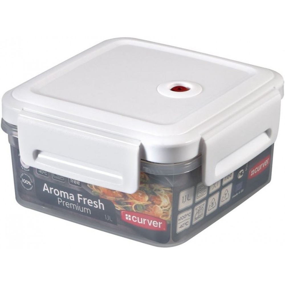 CURVER Pojemnik na żywność AromaFresh Premium, 15 x 15 x 8,1cm, 1,1l, 00375-540Szczelny i odporny na temperatury pojemnik na żywność wykonany został z materiałów najwyższej jakości. Innowacyjność jego budowy polega na zastosowaniu warstwy silikonu zintegrowanego z pokrywą pojemnika oraz zatrzasków, które zapewniają maksymalną szczelność opakowania. Silikonowy wentyl umożliwia stosowanie go w kuchence mikrofalowej. Pojemnika możecie używać w temperaturach: -40C do +100C. Nadaje się do przechowywania żywności świeżej, suchej, ale też płynów. Niezastąpiony w Twoim domu. Produkt posiada certyfikat dopuszczający do kontaktu z żywnością.