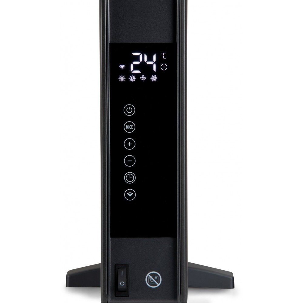 Regulowany termostat (5–45 °C), tryb ECO oraz programowanie tygodniowe pomagają zoptymalizować zużycie energii. Cicha praca i elegancka metalowa obudowa w matowym antracycie sprawiają, że urządzenie idealnie pasuje do nowoczesnych wnętrz.