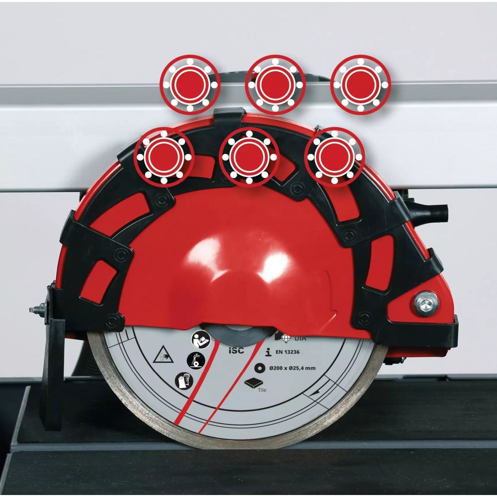 Promieniowa przecinarka do glazury TE-TC 620 U to niezawodne, wysokiej jakości i wydajne narzędzie do szybkiego i dokładnego cięcia płytek ściennych i podłogowych. Wytrzymały silnik o mocy 900 W zapewnia dużą moc do napędzania diamentowej tarczy tnącej o średnicy 200 mm z dużą siłą przez trudny do cięcia materiał. Dzięki bardzo dużej długości 620 mm można z łatwością ciąć nawet wielkoformatowe płytki. Przecinarka TE-TC 620 U jest wyposażona w głowicę silnika, którą można bezstopniowo obracać w zakresie od 0° do 45° za pomocą sześciu łożyskowanych prowadnic silnika, co zapewnia precyzyjne i szybkie cięcie. Dzięki precyzyjnie regulowanemu aluminiowemu ogranicznikowi kątowemu, cięcia ukośne, podwójne cięcia ukośne lub cięcia pod kątem można wykonać w zaledwie kilku prostych krokach. Pompa chłodząca zapewnia optymalne chłodzenie tarczy diamentowej i bezpyłową pracę. Wanna na wodę wykonana z litej blachy stalowej zawiera również kosz na zanieczyszczenia z matami filtracyjnymi, które można prać, dzięki czemu grubsze cząstki nie dostają się do pompy. Duży stół roboczy z antypoślizgową gumową powierzchnią spoczywa na solidnej, składanej ramie podstawy z regulacją wysokości i umożliwia ergonomiczną, bezpieczną pracę. Dzięki kółkom transportowym i uchwytowi transportowemu maszynę można łatwo przemieszczać.