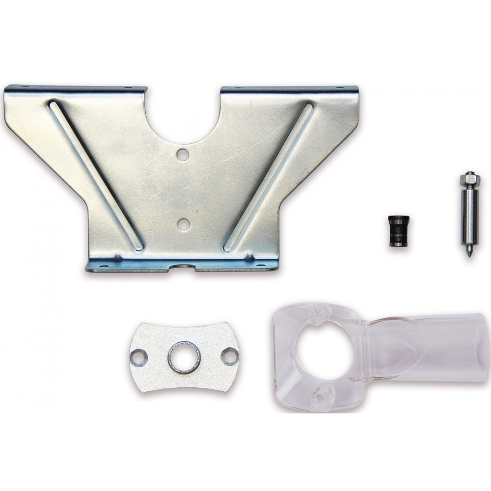 W zestawie znajdują się tuleje zaciskowe (6 i 8 mm), ogranicznik równoległy, trzpień centrujący, pierścień kopiujący oraz narzędzia do wymiany frezu.