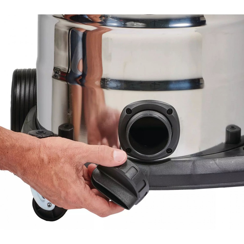 Innowacyjny system oczyszcza filtr po naciśnięciu przycisku po dłuższej pracy lub przy dużym zapyleniu i przywraca maksymalną moc ssania. Urządzenia elektryczne, takie jak szlifierki ścienne lub szlifierki do suchej zabudowy, można wygodnie podłączyć do automatycznego gniazda urządzenia (maks. moc wyjściowa 2000 W), co oznacza, że gdy podłączone narzędzie jest włączane i wyłączane, odkurzacz włącza się i wyłącza w tym samym czasie. Oznacza to, że odkurzacz do pracy na mokro/sucho zapewnia czyste ssanie i zasilanie w tym samym czasie – i jest niezwykle wygodny. Odporny na rdzę i wytrzymały zbiornik ze stali nierdzewnej może pomieścić do 30 litrów zanieczyszczeń i płynów, a zintegrowany korek spustowy wody sprawia, że opróżnianie go jest dziecinnie proste. Dzięki kołom, kółkom i uchwytowi na kółkach odkurzacz do pracy na mokro/sucho można łatwo przetransportować do miejsca użytkowania. Wytrzymały wąż ssący z tworzywa sztucznego o długości 3 metrów i średnicy 36 milimetrów oraz kabel o długości 5 metrów zapewniają promień działania wynoszący 8 metrów, co oznacza, że odkurzacz może być również używany do zastosowań podwieszanych. Dzięki uchwytowi na akcesoria, uchwytowi na kabel i uchwytowi na rurę ssącą do rury teleskopowej ze stali nierdzewnej z regulatorem powietrza, odkurzacz i akcesoria są nie tylko szybko i schludnie schowane, ale równie szybko gotowe do ponownego użycia.