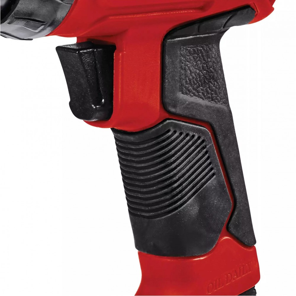 Młot pneumatyczny Einhell TC-PC 45 to mocny i wytrwały pomocnik do prac renowacyjnych i rozbiórkowych wokół domu i ogrodu, niezależnie od tego, czy użytym materiałem jest kamień czy metal. Antypoślizgowy, gumowany uchwyt zapewnia bezpieczną pracę. Przy maksymalnym ciśnieniu roboczym 6,3 bara narzędzie o szybkości uderzenia do 4500^min-1 zapewnia siłę uderzenia do 1,2 dżuli. Sześciokątne gniazdo zapewnia bezpieczne prowadzenie dłuta. Wytrzymały młot kujący na sprężone powietrze oferuje najlepszą wydajność z węża o średnicy wewnętrznej 9 milimetrów. Czteroczęściowy zestaw dłut 120mm do wielu zastosowań jest zawarty w zakresie dostawy wraz z butelką oleju, złączką wtykową i sprężyną naciągową. Dostarczany w praktycznej walizce do transportu i przechowywania.