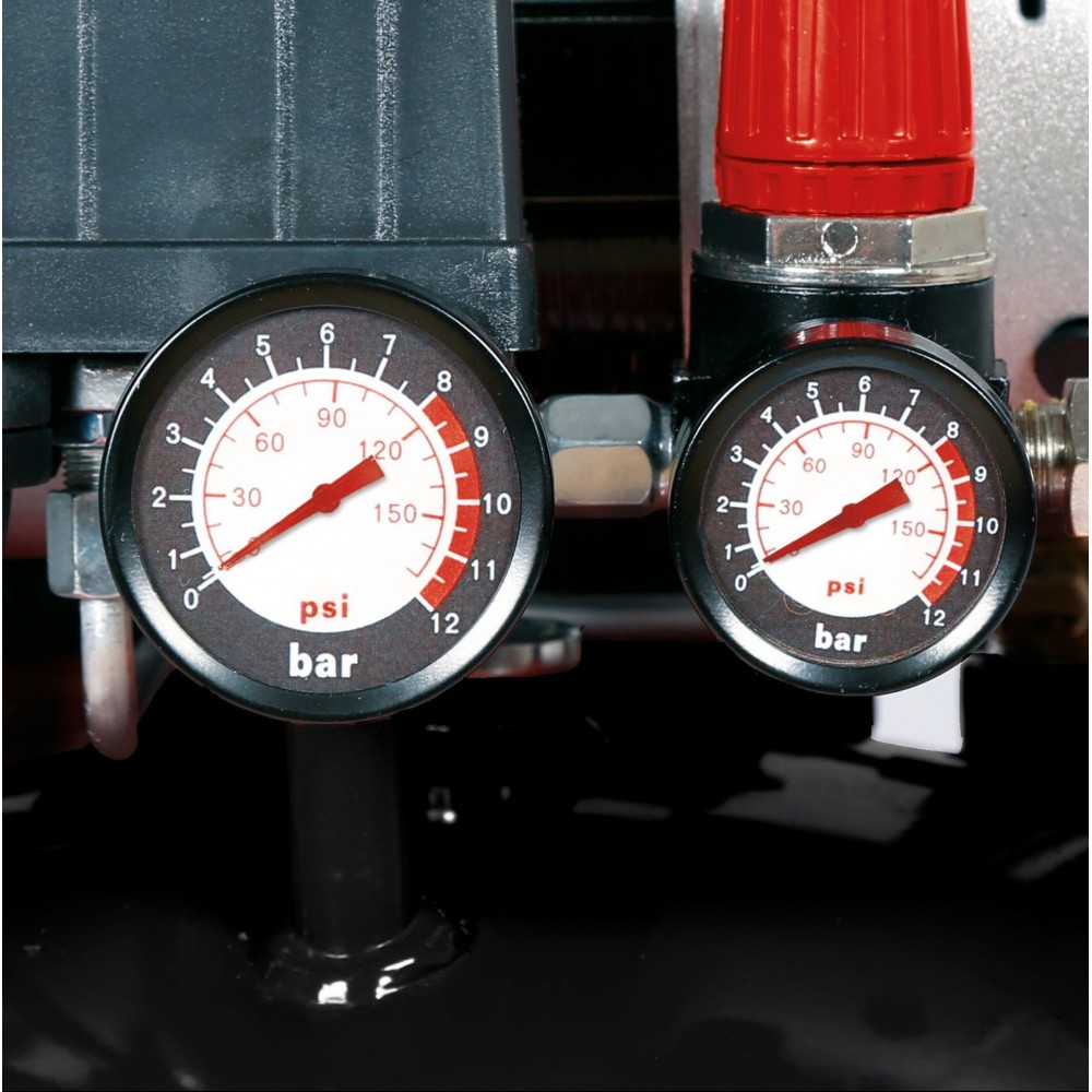 Sprężarka TE-AC 24 Silent to zupełnie nowa jakość w kategorii kompresorów przeznaczonych do przydomowego warsztatu lub garażu. Nowoczesny kompresor charakteryzuje się znacznie niższym poziomem hałasu (57dB) na tle konwencjonalnych sprężarek o takiej samej mocy. Konstrukcja polegająca na umieszczeniu zbiornika w pionie pozwala na zaoszczędzenie miejsca w garażu czy przydomowym warsztacie. Ciśnienie robocze można regulować do 8 bar za pomocą reduktora ciśnienia, co zapewnia dokładną obsługę w szerokim zakresie prac związanych ze sprężonym powietrzem. Konstrukcja bezolejowa pompy, która nie wymaga smarowania, jest nie tylko wygodniejsza w obsłudze z powodu ograniczonego zakresu konserwacji ale również pozwala na transport sprężarki w dowolnej pozycji. Ciśnienie robocze sprężarki możemy odczytać ze zintegrowanego manometru. Wygodny uchwyt transportowy oraz niska waga produktu zapewnia łatwy transport. Duże stopy tłumiące zapobiegają drganiom i redukują hałas. Dzięki zaworowi zwrotnemu zadbano o bezpieczeństwo użytkownika. 24-litrowy zbiornik zapewnia optymalne rezerwy sprężonego powietrza oraz udzielana jest 10 letnia gwarancja na powłokę antykorozyjną zbiornika.