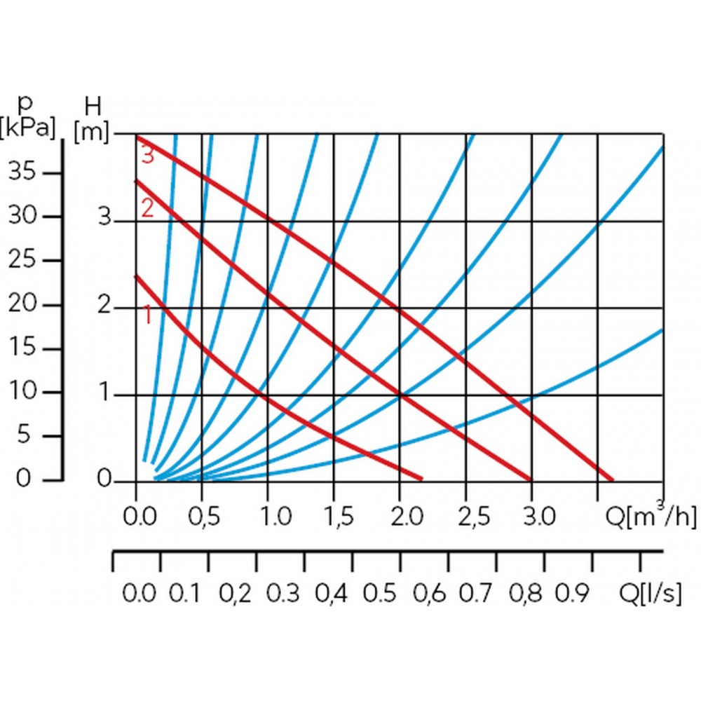 Korpus pompy wykonany jest z żeliwa, obudowa odlana z aluminium, a wirnik uformowany z tworzywa. Wysokiej jakości silnik dwubiegunowy, asynchroniczny, nie wymaga ochrony przed przeciążeniem, posiada trzy prędkości obrotowe, regulowane za pomocą specjalnego przełącznika zamontowanego na skrzynce zaciskowej, co pozwala dostosować pracę pompy do charakterystyki instalacji. Urządzenie zgodne z normą europejską EN 60335-1 i EN 60335- 2-51.