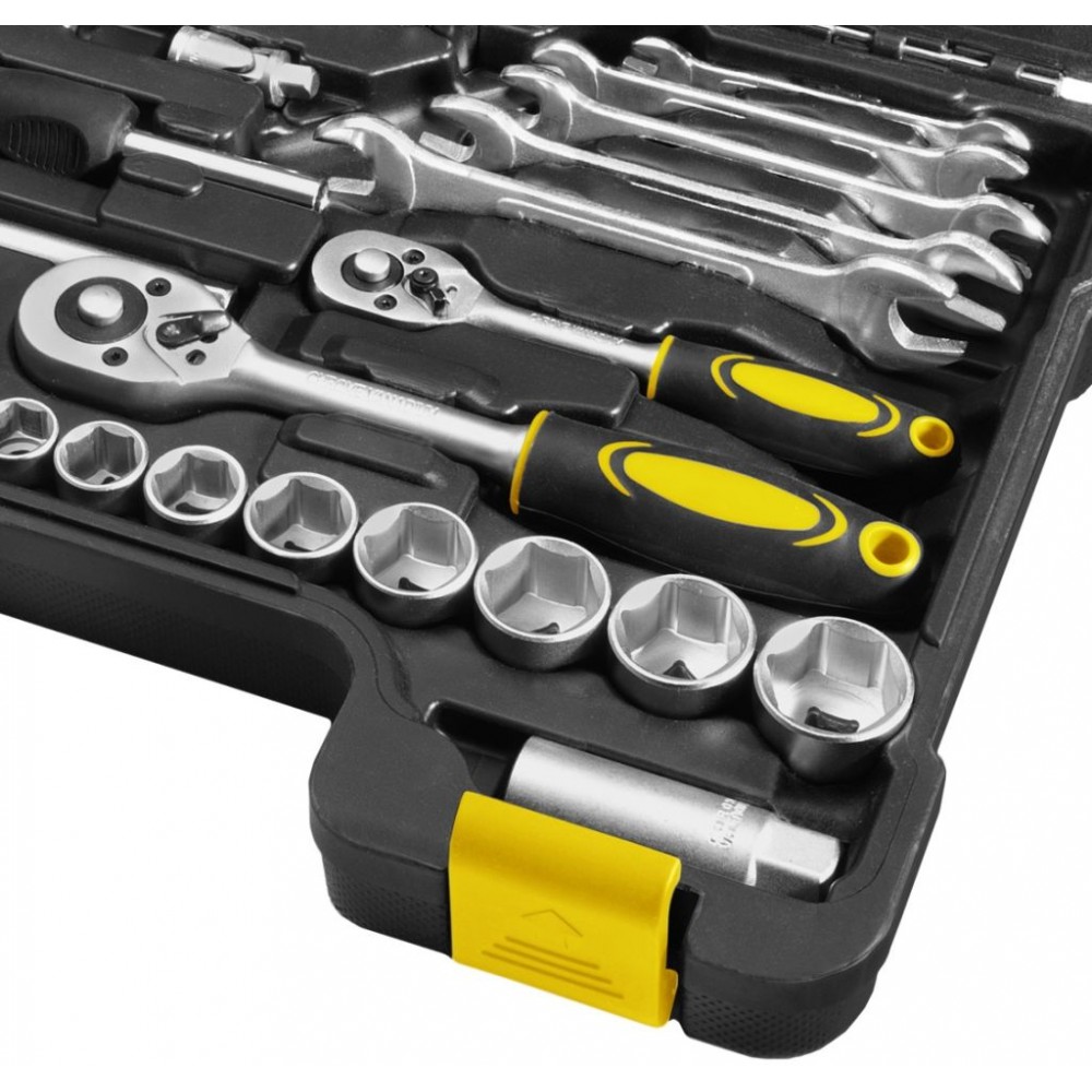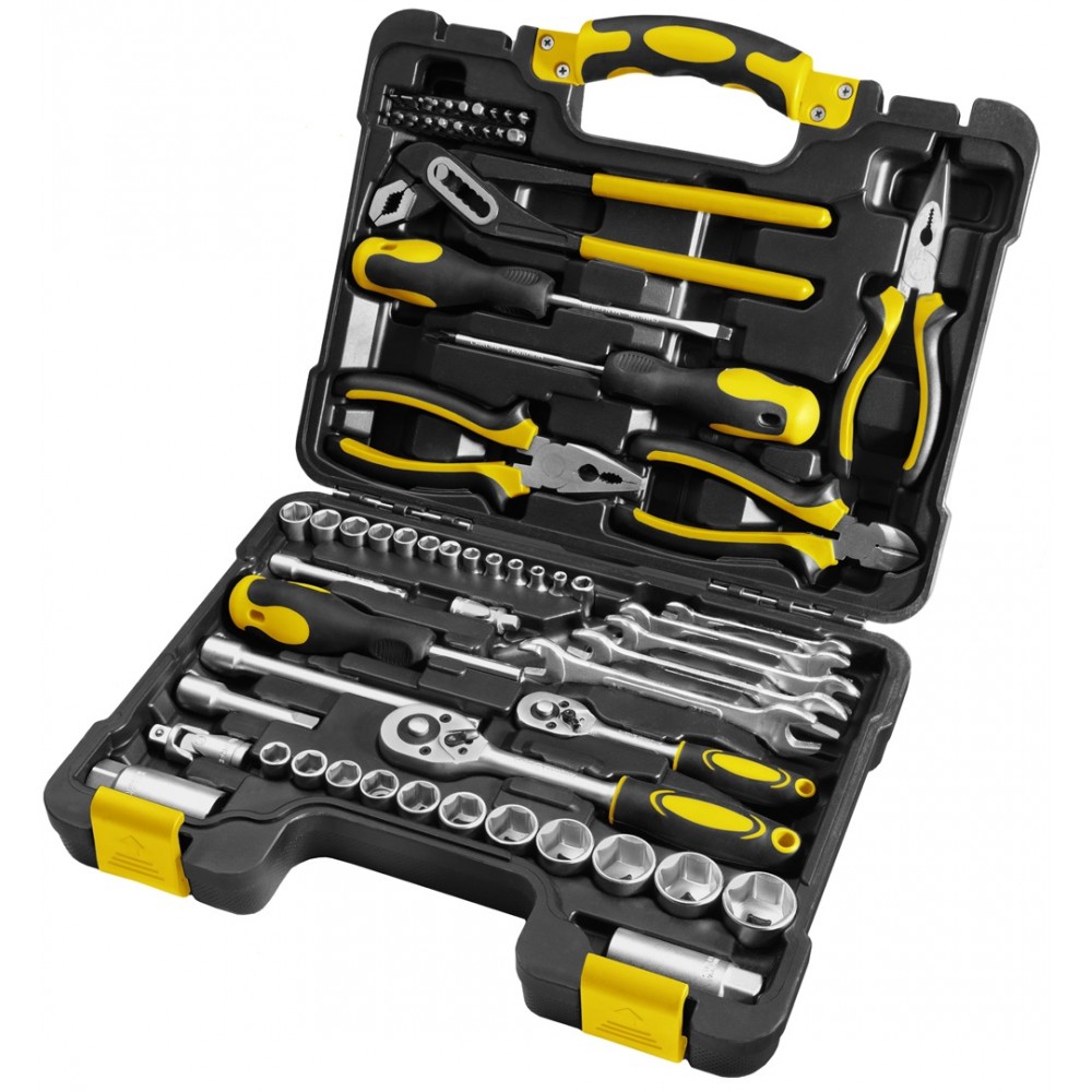 Zestaw narzędzi składa się z sześćdziesięciu pięciu części, w tym grzechotek o rozmiarze1/4 oraz 3/8 cala oraz nasadek w rozmiarach od 7 do 24 milimetrów w jakości CR-V. Integralną część zestawu stanowią szczypce tnące boczne, wydłużone proste oraz nastawne. Znajdują się tu również zestawy kluczy oraz wkrętaków. Narzędzia umieszczone zostały w plastikowej skrzynce wyposażonej w ergonomiczną rączkę znajdującą się tylko po jednej stronie skrzynki, dzięki czemu mamy pewność, że zawsze otworzymy ją z właściwej strony i unikniemy wysypania się narzędzi.