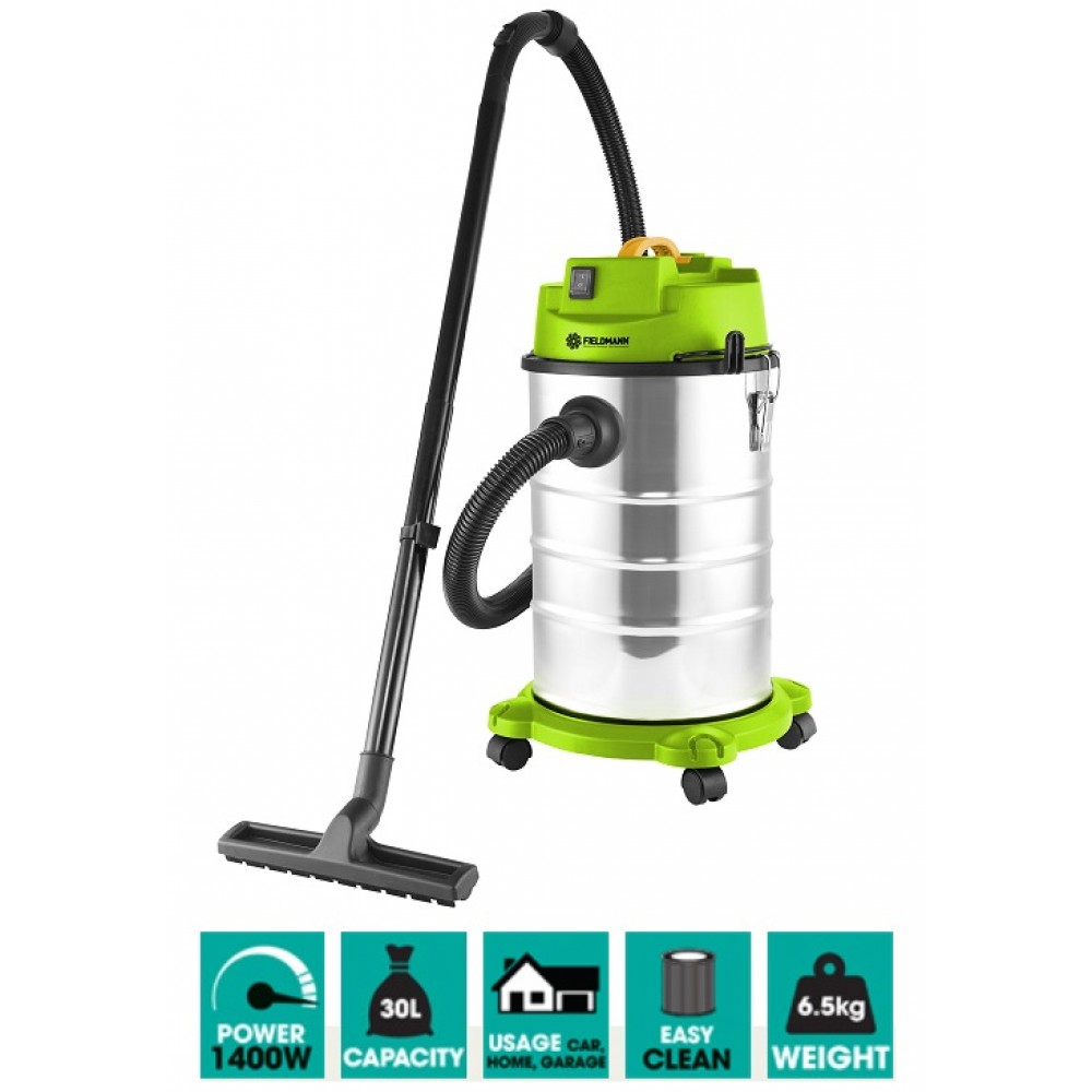 Odkurzacz do pracy na mokro i na sucho o mocy tysiąc czterysta Watt jest wyposażony w bawełniany filtr z mocnymi włóknami wyłapujący najdrobniejsze zanieczyszczenia. Bawełniany filtr jest zdejmowany intuicyjnie bez użycia narzędzi. Wystarczy odpiąć dwie klamry i zdjąć silnik. Chromowany pojemnik o pojemności trzydziestu litrów, wyposażony w podstawkę z kółkami, wystarcza na odpowiednią ilość odkurzanego materiału i wodę. Odkurzacz jest wyposażony w plastikowy wąż z akcesoriami gwarantującymi komfortowe sprzątanie podwórka, garażu, warsztatu czy samochodu.