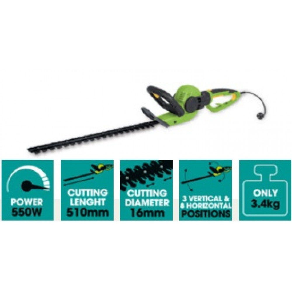 Długość prowadnicy wynosi w tym przypadku 51 cm, a silnik elektryczny ma moc 550 W. Można pracować z roślinami o gałęziach aż do średnicy 16mm. Kwestią oczywistą jest system podwójnych wyłączników zabezpieczających, które zapobiegają przypadkowemu samoczynnemu włączeniu silnika