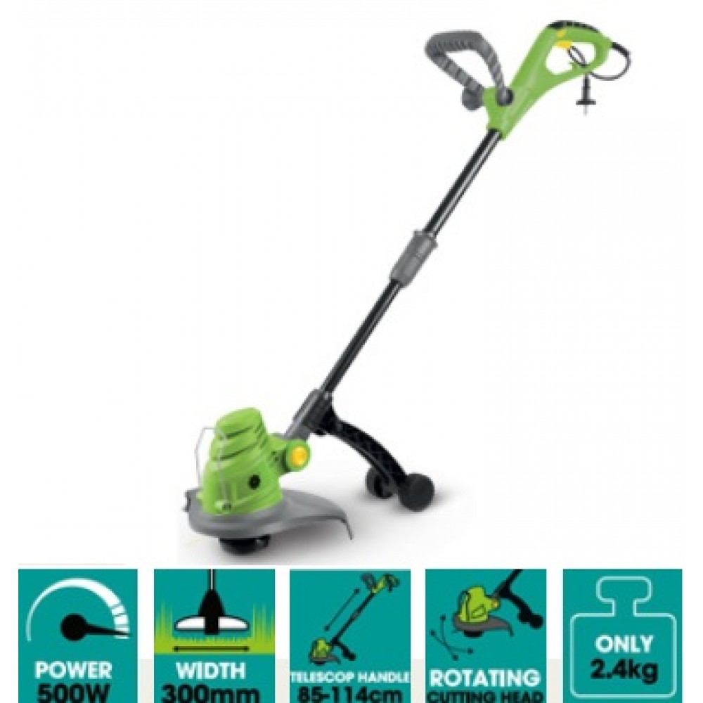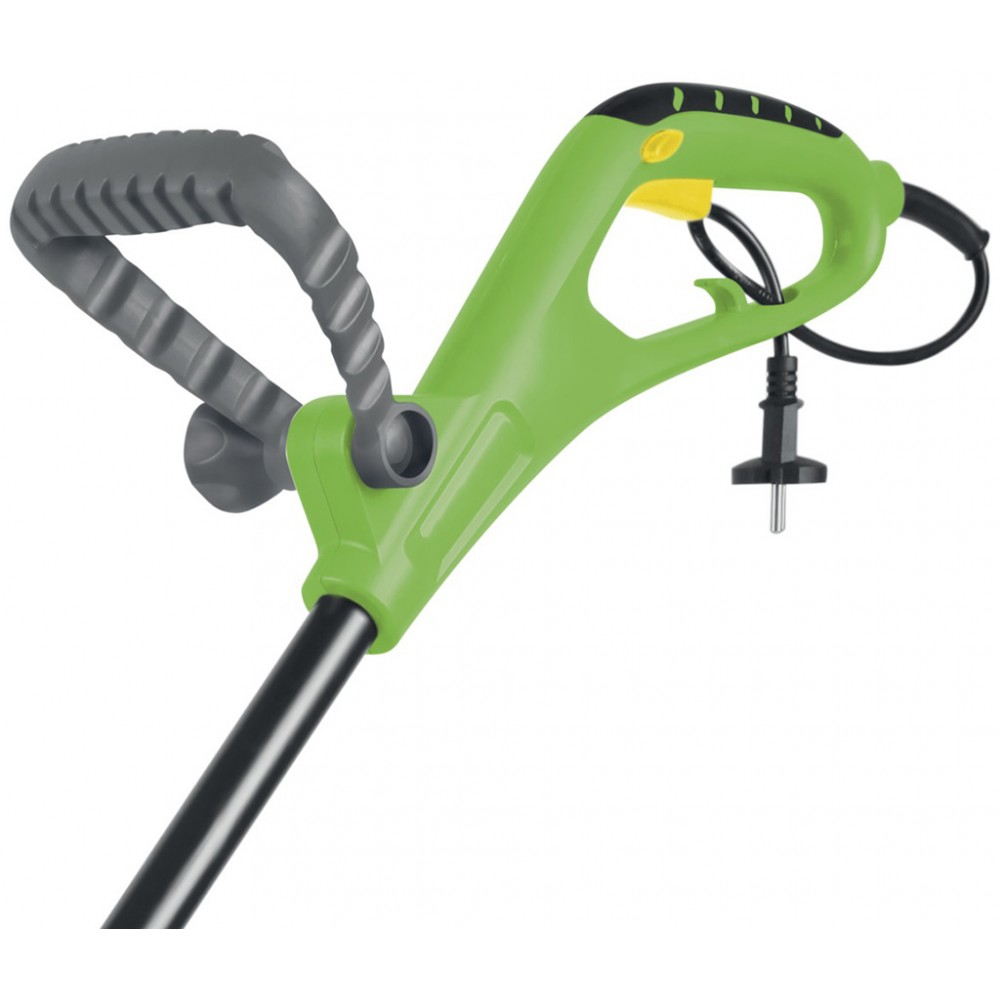Podkaszarka żyłkowa z silnikiem elektrycznym dedykowana do przycinania brzegów trawnika oraz wokół drzewek i krzewówPół-automatyczna głowica tnąca jest wyposażona w dwie żyłki, dzięki czemu osiąga szerokość koszenia 30 cm