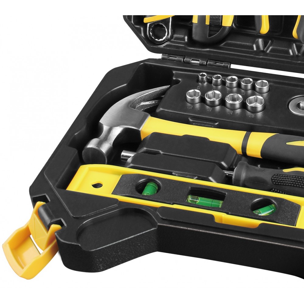 Zestaw narzędzi składający się z 60 części wraz z kluczem zapadkowym 1/4" oraz nasadkami od 5 do 13 mm o jakości CR-V. W zestawie znajdują się również szczypce ukośne, szczypce do drutu, młotek, poziomica, klucze imbusowe, śrubokręt oraz zestaw bitów. Poza tym znajdziecie tu również uniwersalny klucz francuski, nóż oraz miarę taśmową. Wszystko to w plastikowej walizce wyposażonej w ergonomiczną rączkę, umiejscowienie której pozwala na otworzenie walizki tylko z właściwej strony, dzięki czemu narzędzia nie wysypią się z niej przy otwarciu.