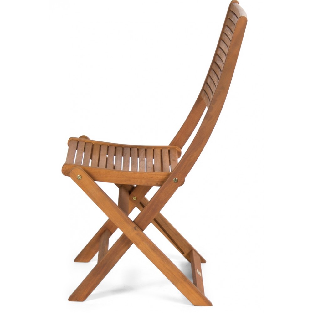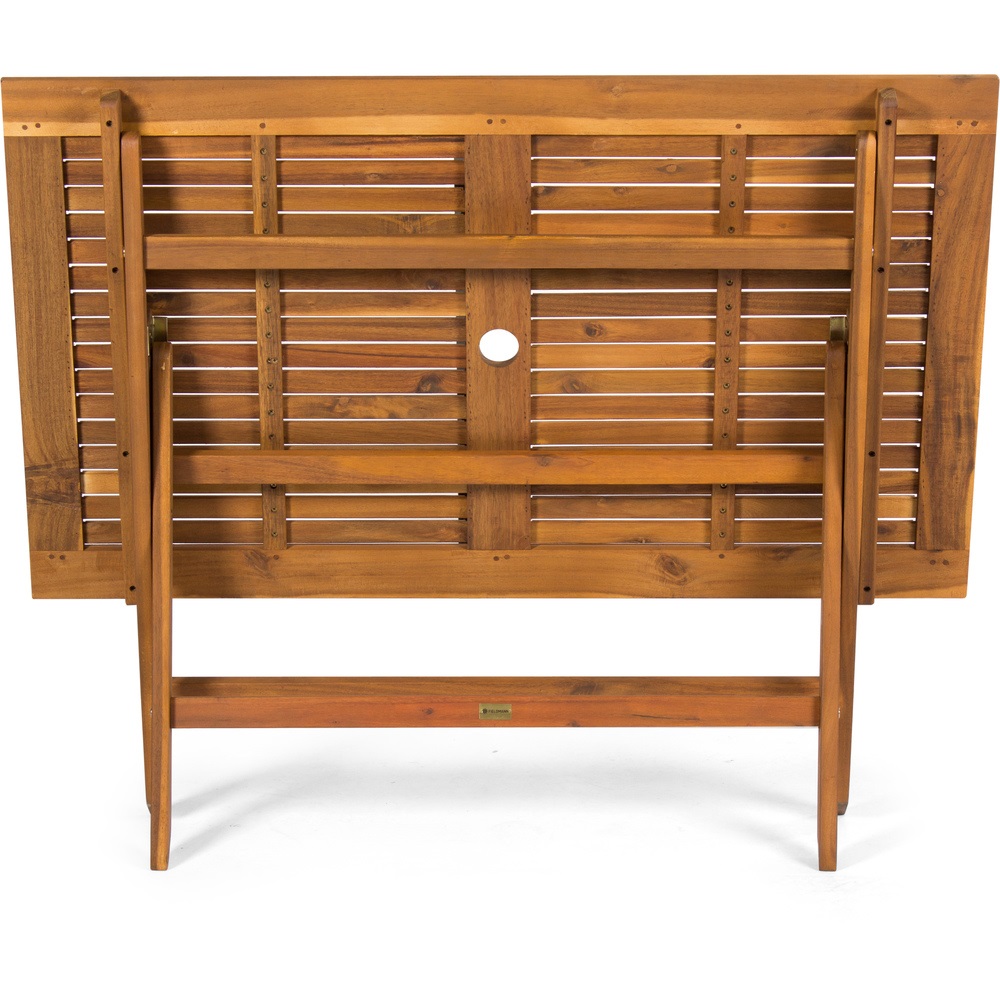 Zestaw mebli ogrodowych składający się z prostokątnego stołu i czterech krzeseł. Wysokiej jakości i ergonomiczne krzesła o wymiarach Sz. 49 x Gł. 57 x V94 cm można składać. Prostokątny stół o wymiarach Dł. 120 x Sz. 70 x Wys. 75 cm posiada otwór do umieszczenia parasola i można go bardzo łatwo złożyć. Na siedziska krzeseł można dokupić odporne na działanie wody poduszki w kolorze kremowym i zielonym. Cały zestaw wyprodukowany jest z wysokiej jakości drewna tropikalnej akacji.