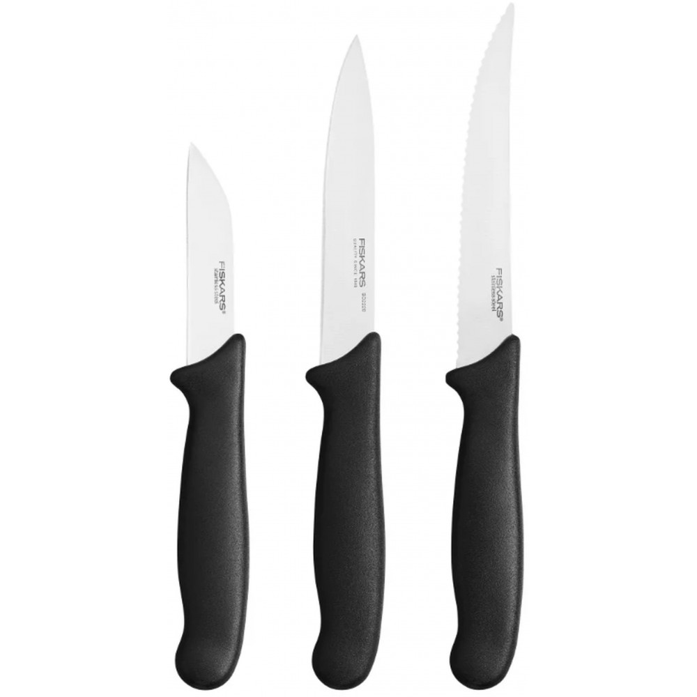 Zestaw Fiskars Essential zawiera trzy specjalistyczne noże – nóż do obierania, nóż do obierania i krojenia oraz nóż śniadaniowy z ząbkowanym ostrzem. Dzięki temu zestawowi wykonasz wszystkie prace od obierania i przygotowywania warzyw i owoców aż po krojenie pomidorów i innych produktów ze skórką.