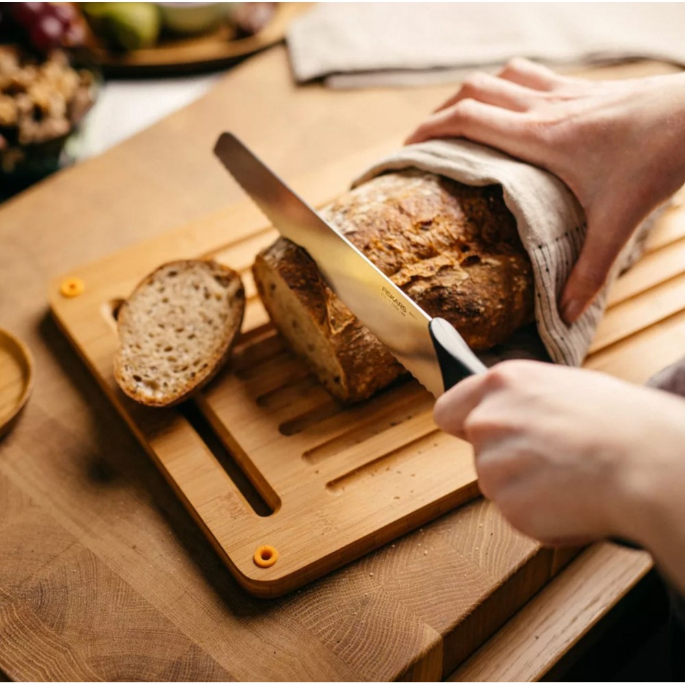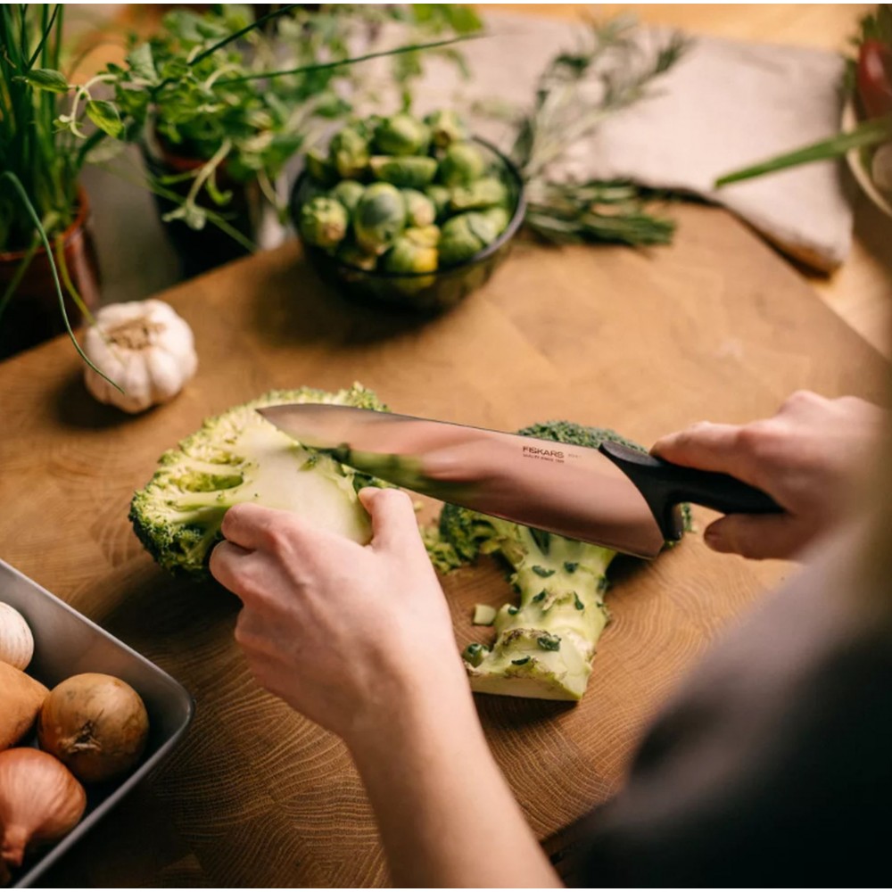 Zestaw startowy FISKARS Essential 3 noże to kompletne wyposażenie każdej kuchni. Zawiera trzy najczęściej używane noże – masywny nóż szefa 21 cm, nóż do obierania 11 cm oraz nóż do chleba i pieczywa 23 cm z ząbkowanym ostrzem. Z tym zestawem wykonasz wszystkie podstawowe prace w kuchni – od krojenia mięsa i warzyw po obieranie owoców i krojenie chleba.