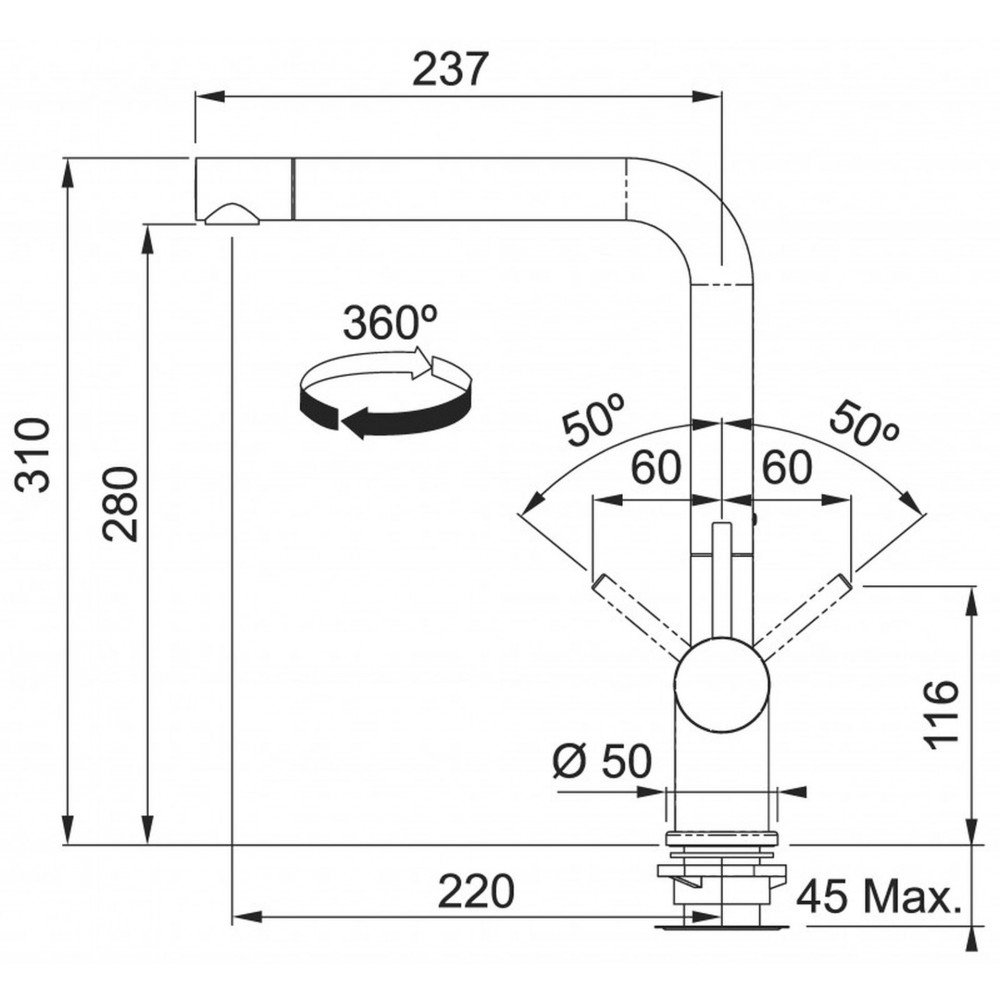 • Obrót wylewki w stopniach: 360 °