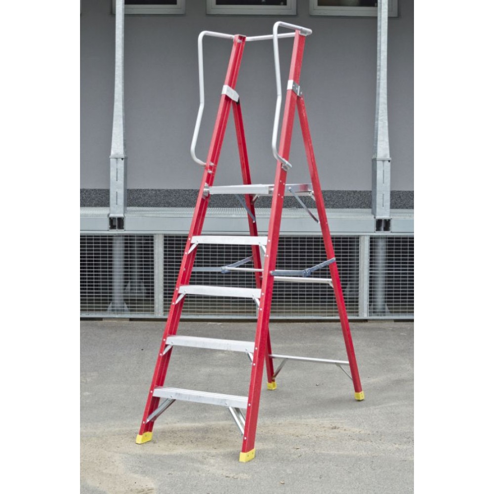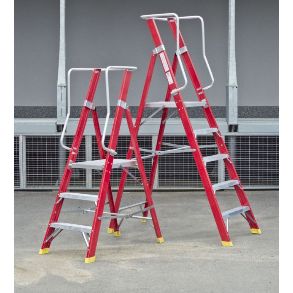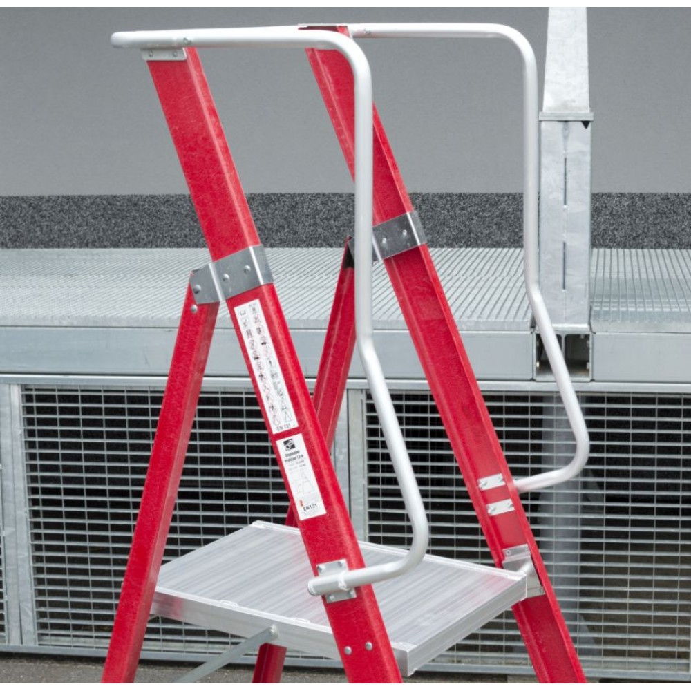 Jednostronne etapy pracy G21 ProfiLine są powszechnie stosowane do prac montażowych w różnych branżach, w usługach sprzątania lub w magazynach.Stabilna konstrukcja stopni o wadze 15,2 kg ma 233 cm wysokości z 4 stopniami i platformą 141 cm wysokości. Panele boczne wykonane są z wysokiej jakości włókna szklanego, które jest odporne na warunki atmosferyczne, korozję i jest stabilne strukturalnie. Po bokach znajdują się stałe uchwyty bezpieczeństwa, które ułatwiają wejście i stanie podczas pracy.
