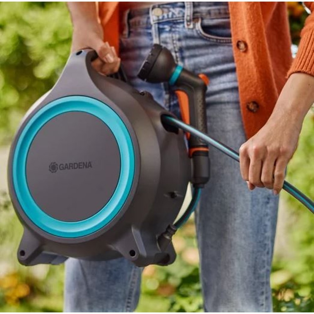 Lekka konstrukcja i ergonomiczny uchwyt ułatwiają przenoszenie bębna między doniczkami lub rabatami. Technologia RollControl zapewnia płynne, bezpieczne zwijanie węża bez zagięć i supłów, a kompaktowa forma pozwala na estetyczne i oszczędzające miejsce przechowywanie. Bęben jest gotowy do użycia od razu po wyjęciu z opakowania.