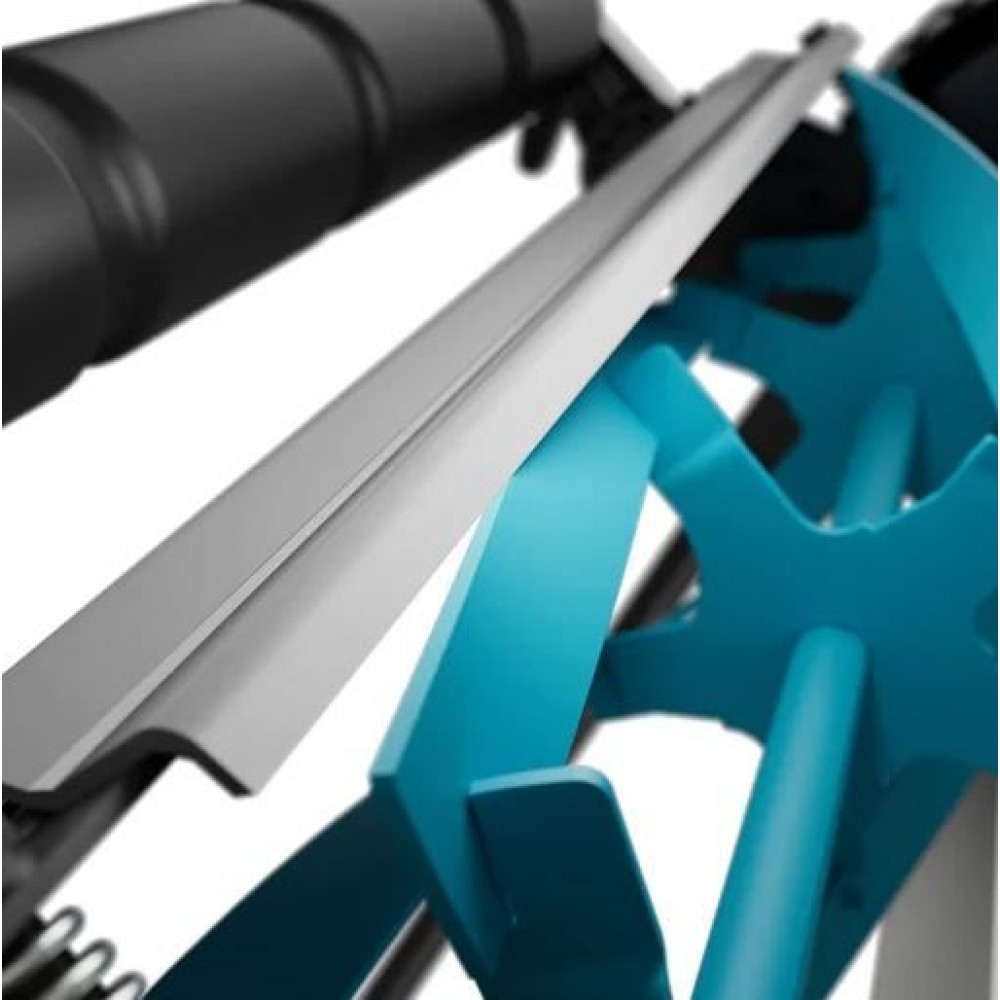Dzięki bezkontaktowej konstrukcji z odstępem 40 mikrometrów między nożami ostrza nie stykają się ze sobą, co pozwala zachować ich trwałą ostrość i gwarantuje równomierne rezultaty przy każdym koszeniu. Lekka budowa, duże koła z wyraźnym bieżnikiem oraz ergonomiczna konstrukcja ułatwiają manewrowanie nawet na nierównym lub wilgotnym terenie. Składany pojemnik na trawę zape