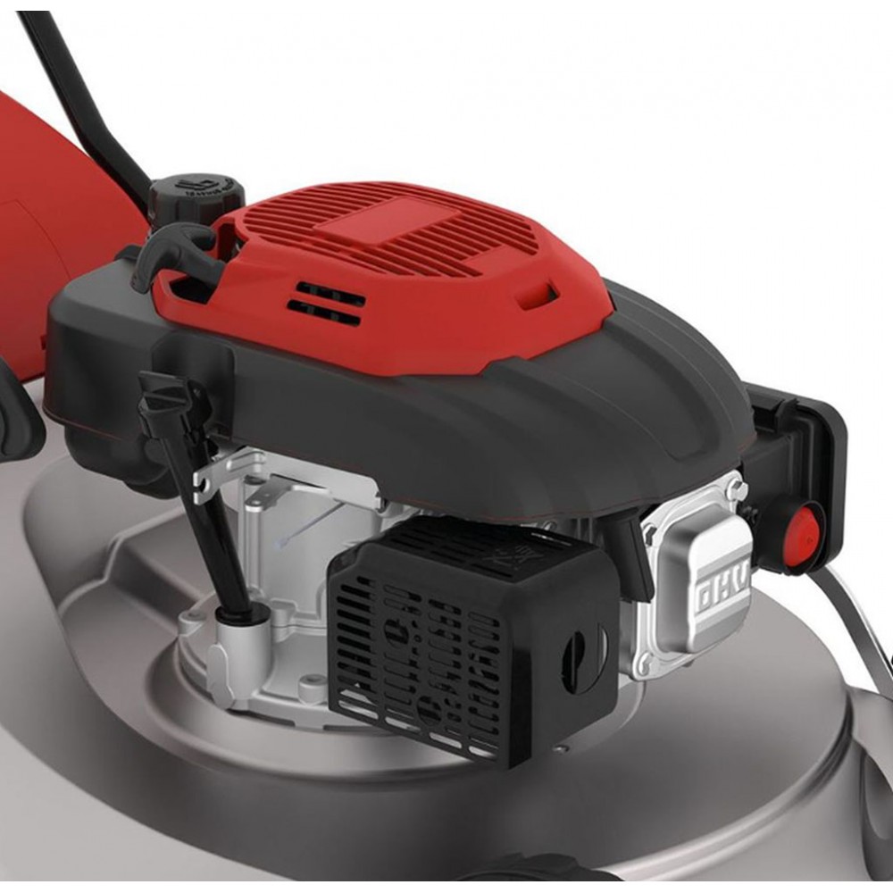 Kosiarka wyposażona jest w napęd na tylne koła z przekładnią, który znacznie ułatwia pracę na większych i bardziej zróżnicowanych terenach. Duże koła jezdne osadzone na łożyskach kulkowych gwarantują płynną jazdę również na nierównym podłożu. Ergonomiczny uchwyt z regulacją wysokości zwiększa komfort obsługi i zmniejsza zmęczenie operatora.