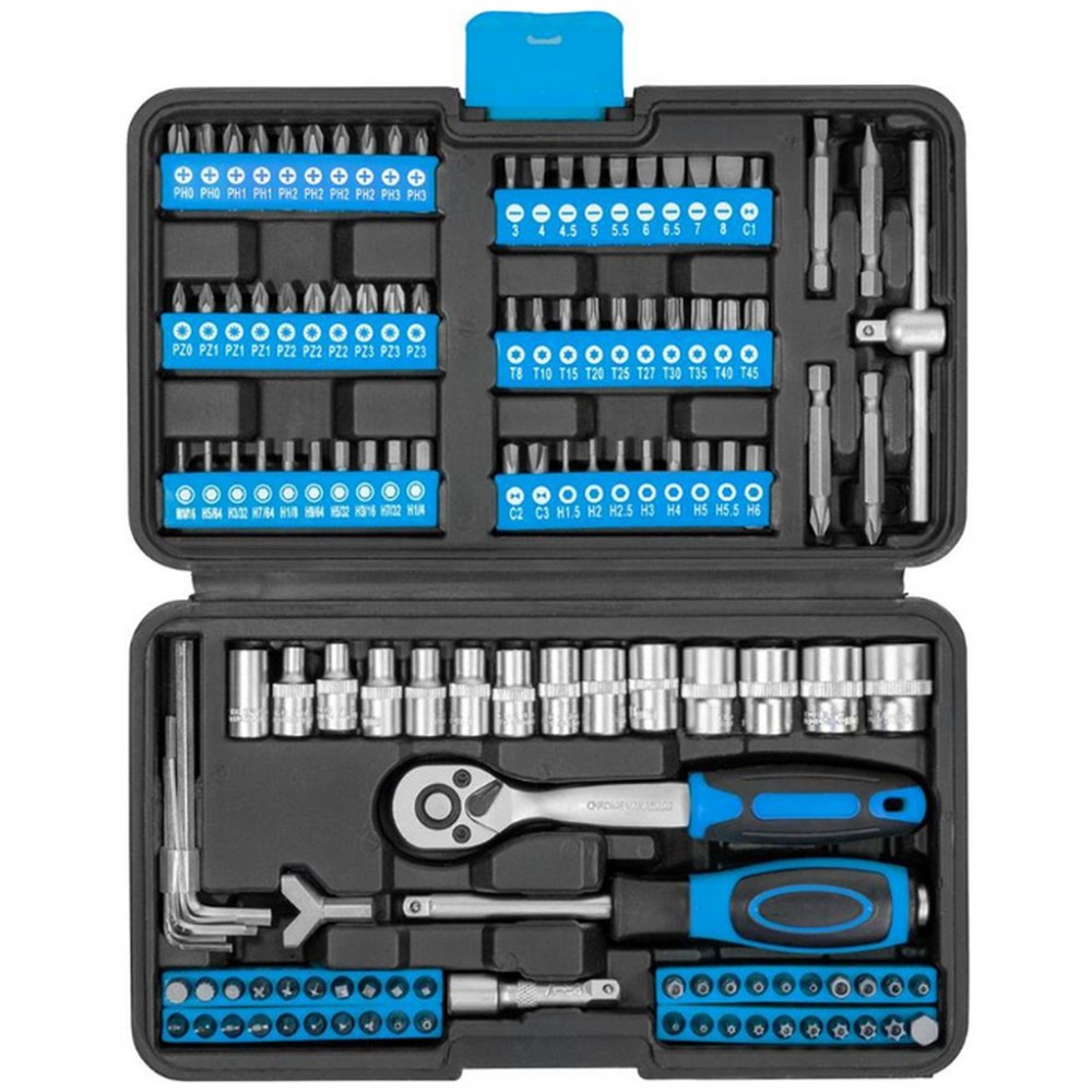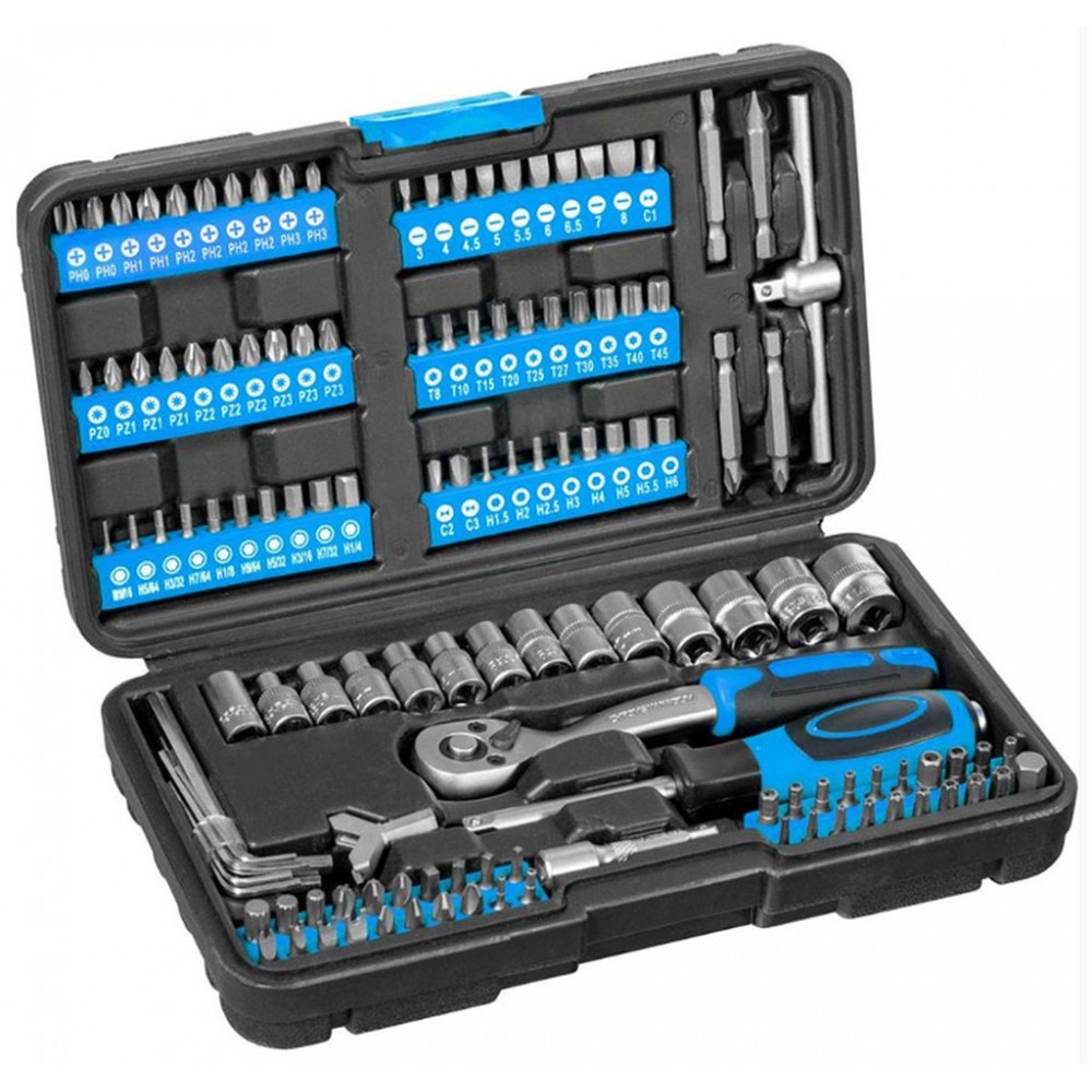 Kompletny zestaw narzędzi do użytku domowego i profesjonalnego w kompaktowej i przejrzystej formie. Uniwersalny 130-elementowy zestaw narzędzi ze stali chromowo-wanadowej, idealny do domowego warsztatu, garażu i zastosowań profesjonalnych. Zawiera grzechotkę 1/4" z 72 zębami, 13 nasadek, 100 bitów oraz praktyczną plastikową walizkę do wygodnego przechowywania.