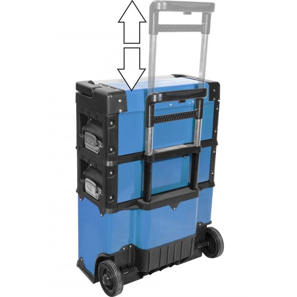 Trzyczęściowa modułowa walizka na narzędzia. Wyjmowana walizka narzędziowa z wkładką na drobne części i narzędzia. Wyjmowany moduł z dwoma szufladami (zamontowanymi na łożyskach kulkowych). Duży pojemnik na wywrotkę (wraz z prętami prowadzącymi). Wszystkie trzy moduły z uchwytami do noszenia, uchwyt teleskopowy. Zamykany na kłódkę, konstrukcja z metalu i tworzywa sztucznego, stabilne, duże kółka z utwardzonej gumy.