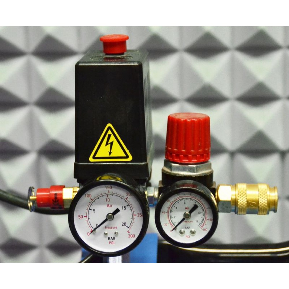 Sprężarka dwucylindrowa ze smarowaniem olejowym, z napędem pasowym. Wyłącznik ciśnieniowy, manometr zbiornika i manometr roboczy, 2 złącza sprężonego powietrza, zawór redukcyjny ciśnienia roboczego, zawór nadmiarowy, zawór zwrotny, zawór spustowy kondensatu, filtr powietrza. Zabezpieczenie przed przeciążeniem. Podwójna noga z gumowym zderzakiem, koła z tworzywa sztucznego, uchwyt transportowy.