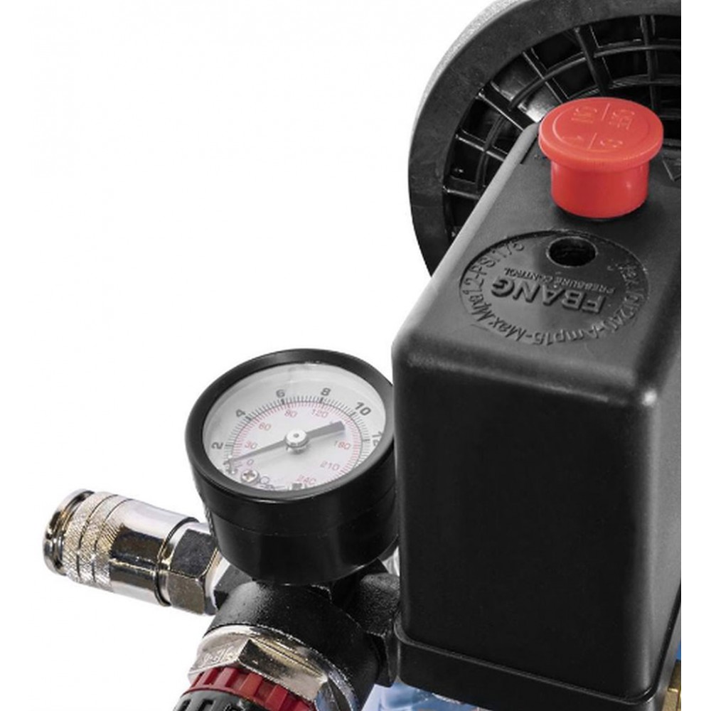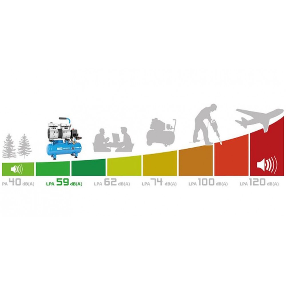 Bezolejowy cichy kompresor z napędem bezpośrednim. Mechaniczny wyłącznik ciśnieniowy, manometr do pomiaru ciśnienia roboczego, 6-litrowy zbiornik z gumowymi amortyzatorami, uchwyt do przenoszenia, 1 sprzęgło pneumatyczne, zawór bezpieczeństwa i śruba spustowa kondensatu.