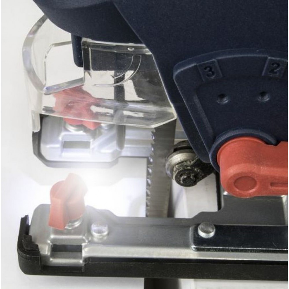 Mocna wyrzynarka do cięcia bezpośredniego / ukośnego / cięcia w litym drewnie, tworzywach sztucznych, metalach itp. Dokładna regulacja skoku w zależności od ciętego materiału (6 prędkości; zakres: 800-3000 min-1); 4-pozycyjna regulacja odchylenia tarczy piły; cięcia kątowe (nachylona płyta podstawy; 2 x 45 °).