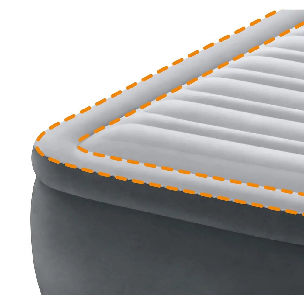 Łóżko dmuchane INTEX Comfort-Plush Elevated zostało zaprojektowane tak, aby zapewnić maksymalny komfort snu. Dzięki tysiącom wytrzymałych włókien poliestrowych wewnątrz konstrukcji zachowuje swój kształt i zapewnia optymalne podparcie ciała, a miękka welurowa powierzchnia gwarantuje przyjemne warunki do odpoczynku. Wzmocniona konstrukcja, poziome komory powietrzne oraz solidne krawędzie zwiększają stabilność i trwałość bez zapadania się. Wbudowana elektryczna pompka QuickFill® (220–240V) umożliwia szybkie pompowanie i opróżnianie w około 4 minuty, dzięki czemu łóżko jest gotowe do użycia bez wysiłku i po złożeniu zajmuje minimalną ilość miejsca.