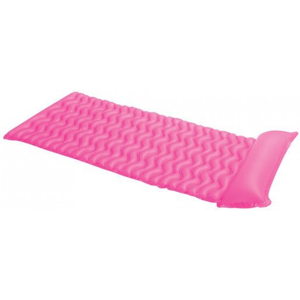 Materac z wzorem fal o wymiarach 229 x 86 cm ze zintegrowanym podgłówkiem. 2 komory powietrzne, podwójnie zgrzane rogi i winyl o grubości 0,25 mm zapewniają stabilność i komfort podczas leżenia. Dostępny w kolorach żółtym, różowym i pomarańczowym.