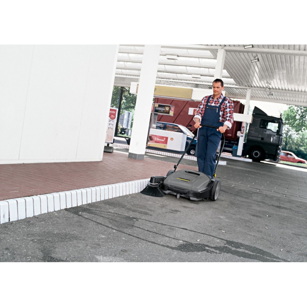 Z uwagi na napęd ręczny jest szczególnie polecana do sprzątania na stacjach benzynowych. Charakteryzuje się cichą pracą, trwałą i prostą konstrukcją oraz wyjątkową łatwością obsługi. Trwała, prosta i niezawodna konstrukcja maszyny, sprawia że jest ona niemal całkowicie bezawaryjna. Mocna rama z tworzywa sztucznego oraz zbiornik zanieczyszczeń są odporne na mechaniczne uszkodzenia. Szczotki zamiatające napędzane są przez oba koła tylne, co umożliwia skuteczne zamiatanie także podczas zakręcania. Szczotka boczna zwiększa szerokość roboczą urządzenia oraz umożliwia zamiatanie przy ścianach i krawężnikach. Wygoda obsługi przekłada się na regulowane położenie uchwytu prowadzącego. Dzięki temu można go dopasować do wzrostu osoby obsługującej. Podczas przechowywania, w celu zmniejszenia przestrzeni zajmowanej przez zamiatarkę, uchwyt prowadzący można całkowicie złożyć.