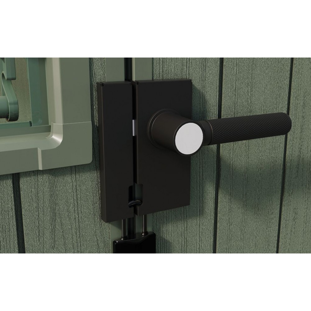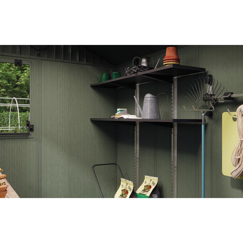 W komplecie znajdują się także 2 praktyczne półki, które ułatwiają organizację przestrzeni. Odpowiednią wentylację zapewnia 5 otwieranych okien (do 7°), które dostarczają świeże powietrze i dodatkowe światło. Drzwi można zamknąć zarówno od wewnątrz, jak i od zewnątrz (kłódka nie znajduje się w zestawie).
