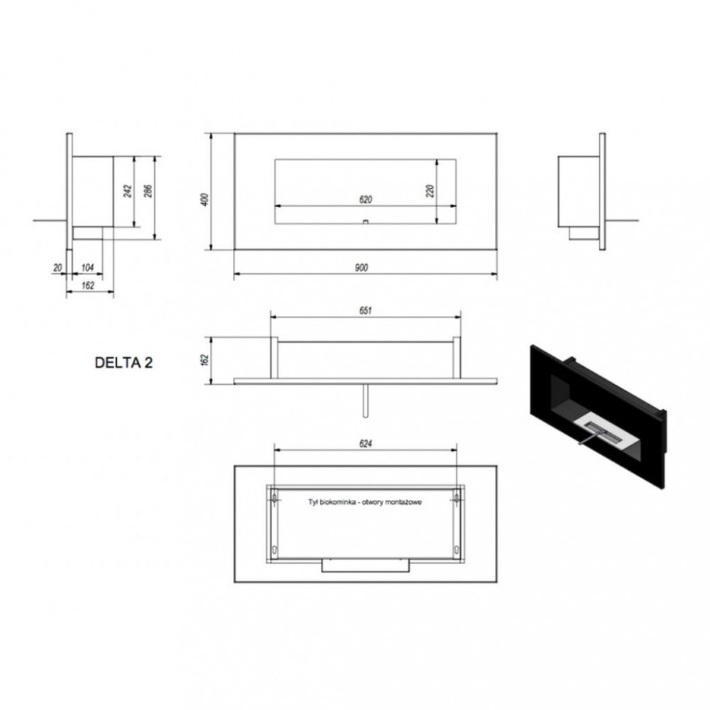 Biokominek Delta 2 Szlif można montować na dwa sposoby: wieszając go bezpośrednio na ścianie (przy użyciu otworów znajdujących się w tylnej ścianie biokominka) lub zamontować we wnęce lub na specjalnie zbudowanym do tego celu elemencie dekoracyjnym wystającym ze ściany.