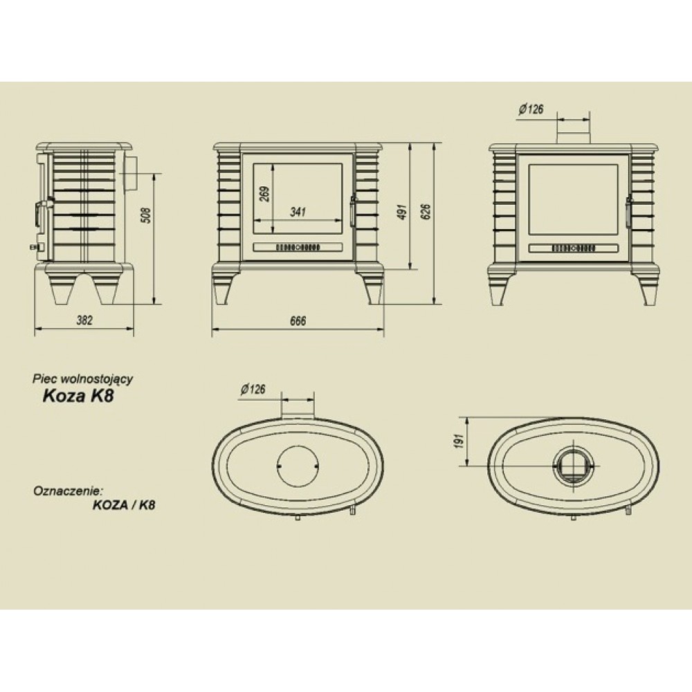 KRATKI Koza K8, 9kW piec wolnostojącyPiec wolnostojący Koza K8 9kW, produkowany przez firmę Kratki.pl, posiada korpus wykonany