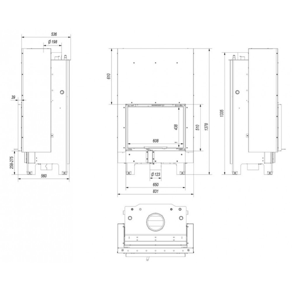 Wkład bezrusztowy - dopalanie na popiele, co oznacza, że opał wypala się na drobny popiół, którego pozostaje minimalna ilość. Uzyskana w ten sposób energia cieplna z drewna zostaje maksymalnie wykorzystana. Płyta dolna wkładu znacznie obniżona w stosunku do drzwi.