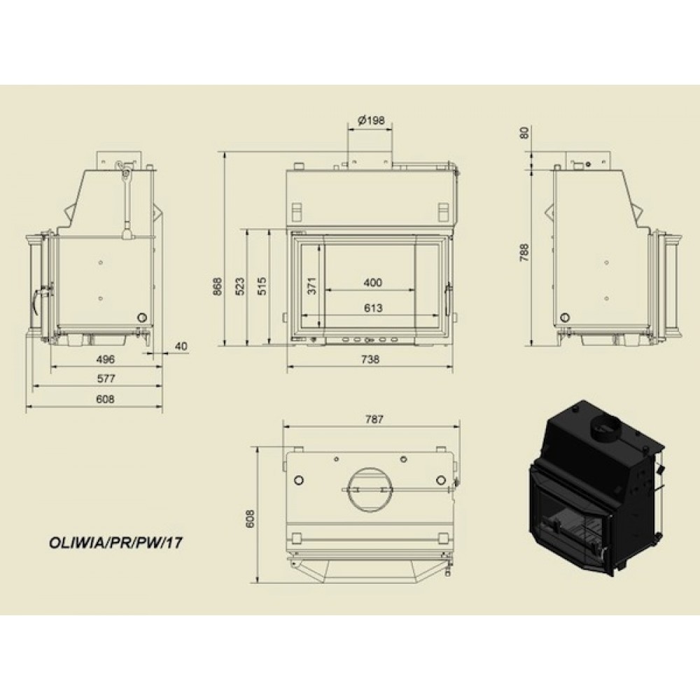 KRATKI Wkład kominkowy z płaszczem wodnym OLIWIA PW 17 pryzmatycznyKominek z zespołem wodnym przystosowany do intensywnego palenia, w których zastosowane technologie i materiały tworzą wydajny, ekonomiczny i ekologiczny wkład o wysokiej sprawności