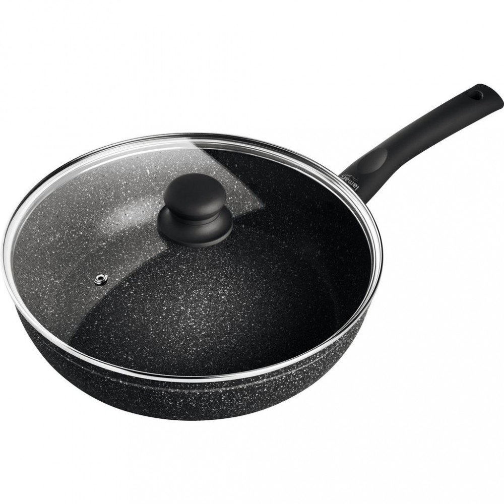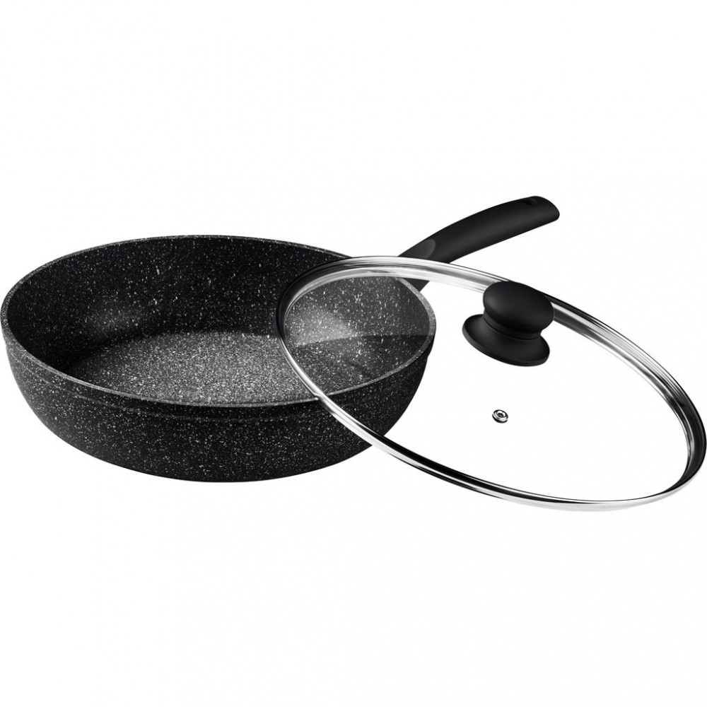 LAMART LT1142 ROCK Patelnia 28cm z pokrywką czarnaPatelnia z pokrywką marki Lamart pochodzi z kolekcji Rock, została wykonana z najwyższej jakości aluminium, a jej powierzchnia została pokryta powłoką marble, która zapobiega przywieraniu przyrządzonych potraw do naczynia. Patelnia jest odporna na bardzo wysokie temperatury, umożliwia łatwe i szybkie przygotowanie smacznego dania. Praktyczna szklana pokrywka idealnie sprawdzi się podczas duszenia i ograniczy straty ciepła.