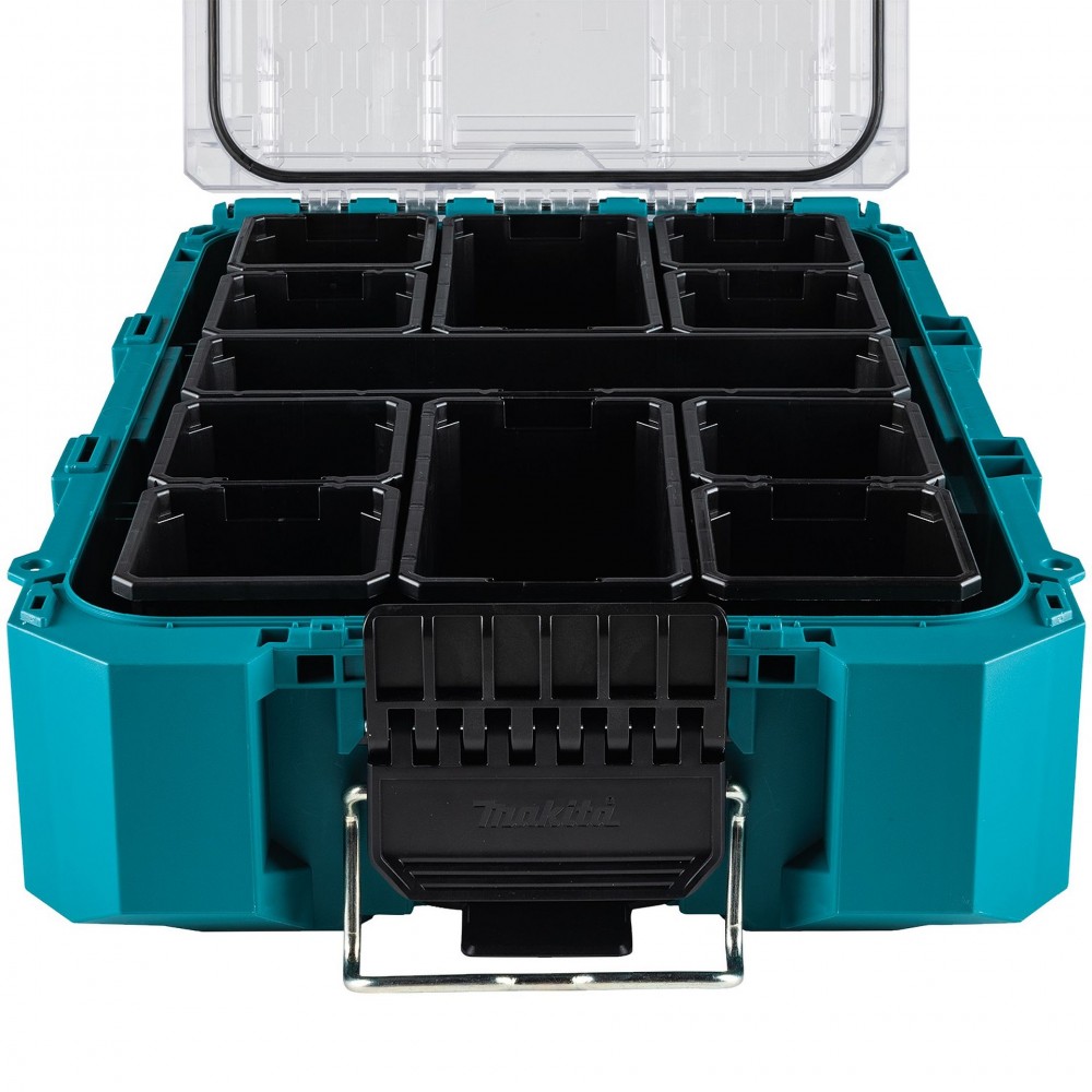 Głęboki, średni organizer MAKTRAK jest częścią modułowego systemu przechowywania MAKTRAK. Dzięki szybkim złączom torowym można tworzyć zestawy skrzynek dopasowane do własnych potrzeb. Przemyślana konstrukcja ułatwia przenoszenie i dostęp do zawartości, a przezroczysta pokrywa pozwala zobaczyć wnętrze z 11 pojemnikami.