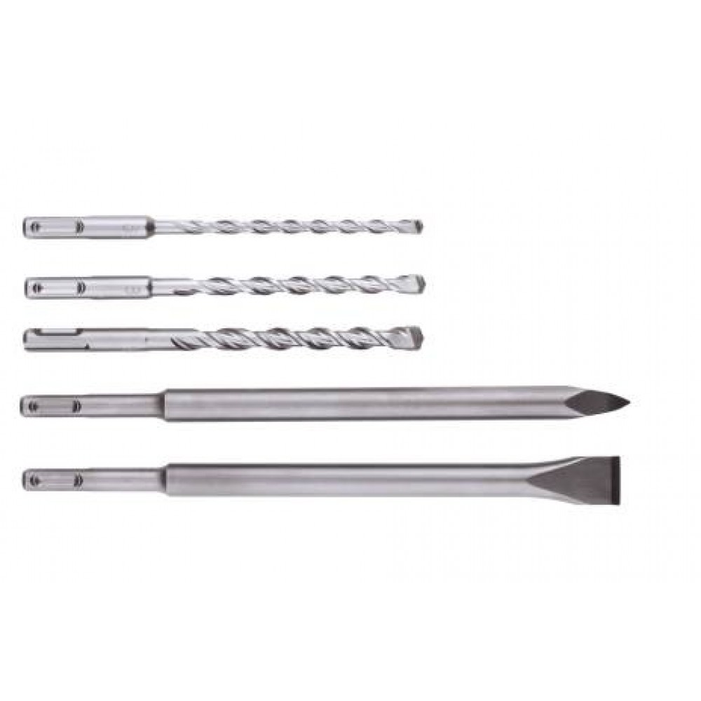 - Zawartość: 1 wiertło udarowe O 6x160 mm, 8x160 mm, 10x160 mm, 1 dłuto szpiczaste 250 mm oraz 1 dłuto płaskie 250x20 mm