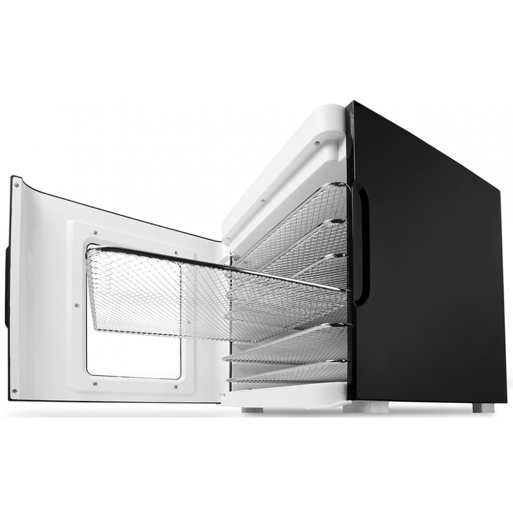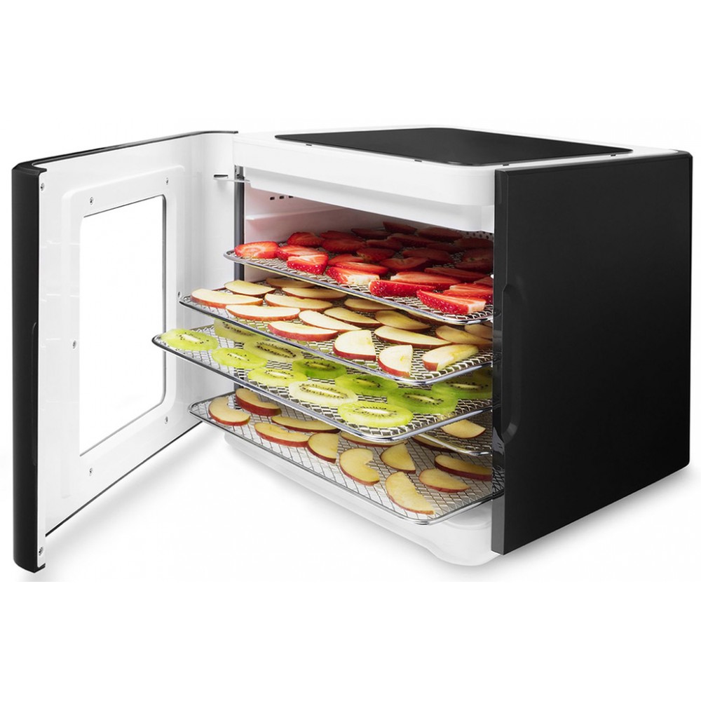 • 6 płyt ze stali nierdzewnej o wymiarach 30x25 cm zapewnia wystarczająco dużo miejsca do suszenia. Suszarka zawiera również wyjmowaną tacę na resztki wody i wszelkie bałagany powstające na dnie podczas suszenia. Jest łatwy do usunięcia, umycia i ponownego umieszczenia do następnej partii.